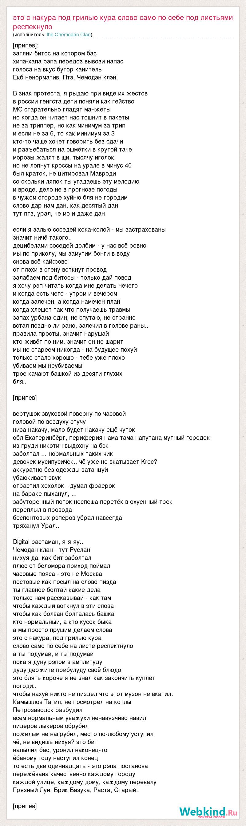 Главная→Исполнители→The Chemodan Clan→Это с накура под грилью кура слово само по себе под листьями респекнуло