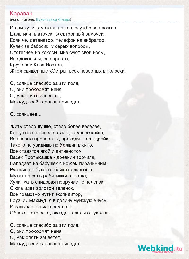 И нам хули таможня, на гос. службе все можно. Шаль или платочек, электронный замочек, Если че, детанатор, телефон на вибратор. Кулек за бабосик, у серых вопросы, Отстегнем на кокосы, мне суют свои носы, Все довольны, все просто, Круче чем Коза Ностра, Жгем священные кОстры, всех неверных в полоски. О, солнце спасибо за эти поля, О, они прокормят меня, О, мак опять зацветет, Махмуд свой караван приведет. О, солнцеее... Жить стало лучше, стало более веселее, Как у нас на населе стал доступнее кайф, Все новые препараты, проходят тест-драйв, Такого не увидишь по Уелшип в кино. Все ставятся ягой и антиенотом, Васек Протыкашка - древний торчила, Нападает на бабушек с ножем пирачинным, Русские не бухают, байкот алкоголю. Мутят на соль ребятишки в школе, Хули, мать спидовая приручает с пеленок, С юга идет золотой теленок, Все грамотно мутит экспидитор, Грузчик Махмуд, я в долину Чуйскую мчусь, И засыпаю на маковом поле, Облака - это вата, звезда - следы от уколов. О, солнце спасибо за эти поля, О, они прокормят меня, О, мак опять зацветет, Махмуд свой караван приведет.