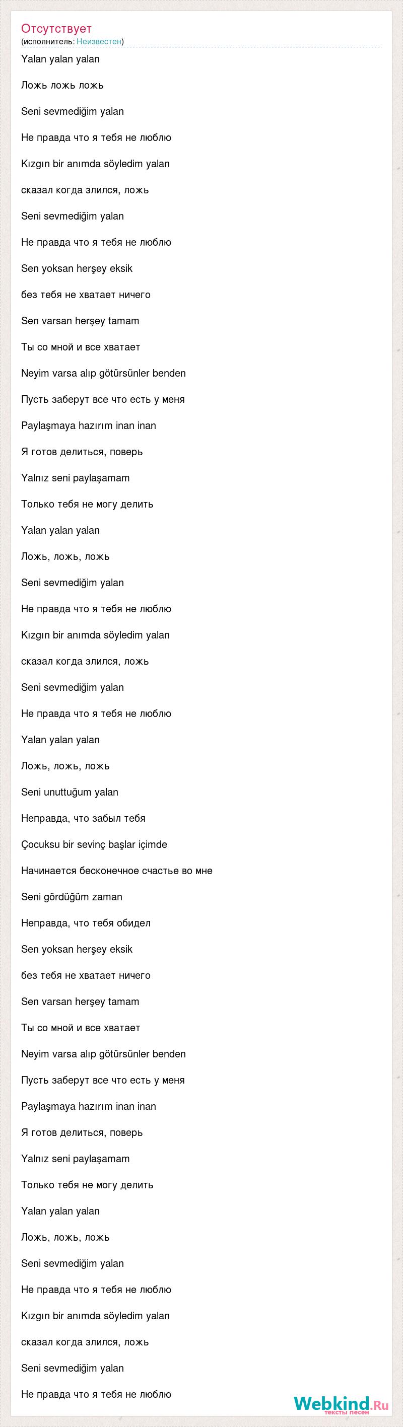 Yalan yalan yalan Ложь ложь ложь Seni sevmediğim yalan Не правда что я тебя не люблю Kızgın bir anımda söyledim yalan сказал когда злился, ложь Seni sevmediğim yalan Не правда что я тебя не люблю Sen yoksan herşey eksik без тебя не хватает ничего Sen varsan herşey tamam Ты со мной и все хватает Neyim varsa alıp götürsünler benden Пусть заберут все что есть у меня Paylaşmaya hazırım inan inan Я готов делиться, поверь Yalnız seni paylaşamam Только тебя не могу делить Yalan yalan yalan Ложь, ложь, ложь Seni sevmediğim yalan Не правда что я тебя не люблю Kızgın bir anımda söyledim yalan сказал когда злился, ложь Seni sevmediğim yalan Не правда что я тебя не люблю Yalan yalan yalan Ложь, ложь, ложь Seni unuttuğum yalan Неправда, что забыл тебя Çocuksu bir sevinç başlar içimde Начинается бесконечное счастье во мне Seni gördüğüm zaman Неправда, что тебя обидел Sen yoksan herşey eksik без тебя не хватает ничего Sen varsan herşey tamam Ты со мной и все хватает Neyim varsa alıp götürsünler benden Пусть заберут все что есть у меня Paylaşmaya hazırım inan inan Я готов делиться, поверь Yalnız seni paylaşamam Только тебя не могу делить Yalan yalan yalan Ложь, ложь, ложь Seni sevmediğim yalan Не правда что я тебя не люблю Kızgın bir anımda söyledim yalan сказал когда злился, ложь Seni sevmediğim yalan Не правда что я тебя не люблю