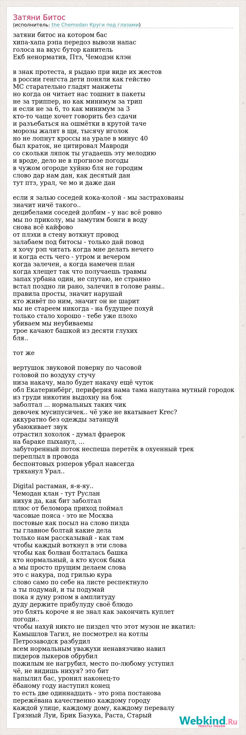 затяни битос на котором бас хипа-хапа рэпа передоз вывози напас голоса на вкус бутор канитель Екб ненорматив, Птз, Чемодэн клэн в знак протеста, я рыдаю при виде их жестов в россии генгста дети поняли как гейство МС старательно гладят манжеты но когда он читает нас тошнит в пакеты не за триппер, но как минимум за трип и если не за 6, то как минимум за 3 кто-то чаще хочет говорить без сдачи и разъебаться на ошмётки в крутой таче морозы жалят в щи, тысячу иголок но не лопнут кроссы на урале в минус 40 был краток, не цитировал Мавроди со скольки ляпок ты угадаешь эту мелодию и вроде, дело не в прогнозе погоды в чужом огороде хуйню бля не городим слово дар нам дан, как десятый дан тут птз, урал, че мо и даже дан если я залью соседей кока-колой - мы застрахованы значит ничё такого.. децибелами соседей долбим - у нас всё ровно мы по приколу, мы замутим бонги в воду снова всё кайфово от плэхи в стену воткнут провод залабаем под битосы - только дай повод я хочу рэп читать когда мне делать нечего и когда есть чего - утром и вечером когда залечен, а когда намечен план когда хлещет так что получаешь травмы запах урбана один, не спутаю, не странно встал поздно ли рано, залечил в голове раны.. правила просты, значит нарушай кто живёт по ним, значит он не шарит мы не стареем никогда - на будущее похуй только стало хорошо - тебе уже плохо убиваем мы неубиваемы трое качают башкой из десяти глухих бля.. тот же вертушок звуковой поверну по часовой головой по воздуху стучу низа накачу, мало будет накачу ещё чуток обл Екатеринбёрг, периферия нама тама напутана мутный городок из груди никотин выдохну на бэк заболтал ... нормальных таких чик девочек мусипусичек.. чё уже не вкатывает Krec? аккуратно без одежды затанцуй убаюкивает звук отрастил хохолок - думал фраерок на бараке пыханул, ... забуторенный поток неспеша перетёк в охуенный трек переплыл в провода беспонтовых рэперов убрал навсегда тряханул Урал.. Digital растаман, я-я-яу.. Чемодан клан - тут Руслан нихуя да, как бит заболтал плюс от беломора приход поймал часовые пояса - это не Москва постовые как посыл на слово пизда ты главное болтай какие дела только нам рассказывай - как там чтобы каждый воткнул в эти слова чтобы как болван болталась башка кто нормальный, а кто кусок быка а мы просто прущим делаем слова это с накура, под грилью кура слово само по себе на листе респектнуло а ты подумай, и ты подумай пока я дуну рэпом в амплитуду дуду держите прибулуду своё блюдо это блять короче я не знал как закончить куплет погоди.. чтобы нахуй никто не пиздел что этот музон не вкатил: Камышлов Тагил, не посмотрел на котлы Петрозаводск разбудил всем нормальным уважухи ненавязчиво навил пидеров лыкеров обрубил пожилым не нагрубил, место по-любому уступил чё, не видишь нихуя? это бит напылил бас, уронил наконец-то ёбаному году наступил конец то есть две одиннадцать - это рэпа постанова пережёвана качественно каждому городу каждой улице, каждому дому, каждому перевалу Грязный Луи, Брик Базука, Раста, Старый