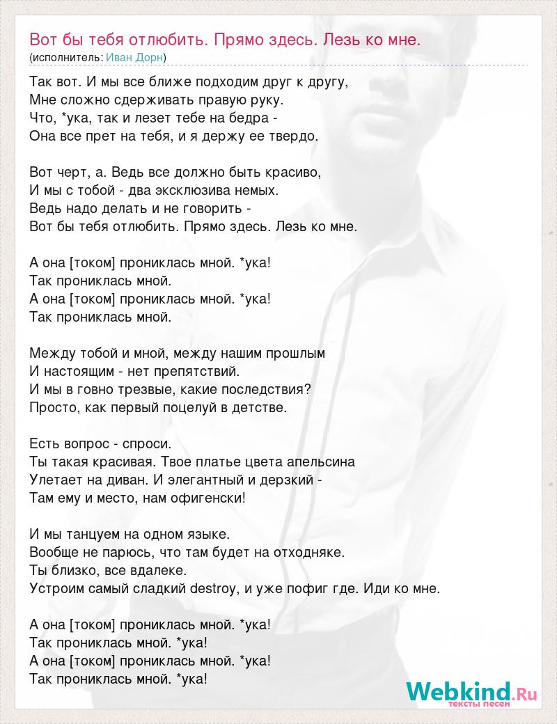 Так вот. И мы все ближе подходим друг к другу, Мне сложно сдерживать правую руку. Что, *ука, так и лезет тебе на бедра - Она все прет на тебя, и я держу ее твердо. Вот черт, а. Ведь все должно быть красиво, И мы с тобой - два эксклюзива немых. Ведь надо делать и не говорить - Вот бы тебя отлюбить. Прямо здесь. Лезь ко мне. А она [током] прониклась мной. *ука! Так прониклась мной. А она [током] прониклась мной. *ука! Так прониклась мной. Между тобой и мной, между нашим прошлым И настоящим - нет препятствий. И мы в говно трезвые, какие последствия? Просто, как первый поцелуй в детстве. Есть вопрос - спроси. Ты такая красивая. Твое платье цвета апельсина Улетает на диван. И элегантный и дерзкий - Там ему и место, нам офигенски! И мы танцуем на одном языке. Вообще не парюсь, что там будет на отходняке. Ты близко, все вдалеке. Устроим самый сладкий destroy, и уже пофиг где. Иди ко мне. А она [током] прониклась мной. *ука! Так прониклась мной. *ука! А она [током] прониклась мной. *ука! Так прониклась мной. *ука!