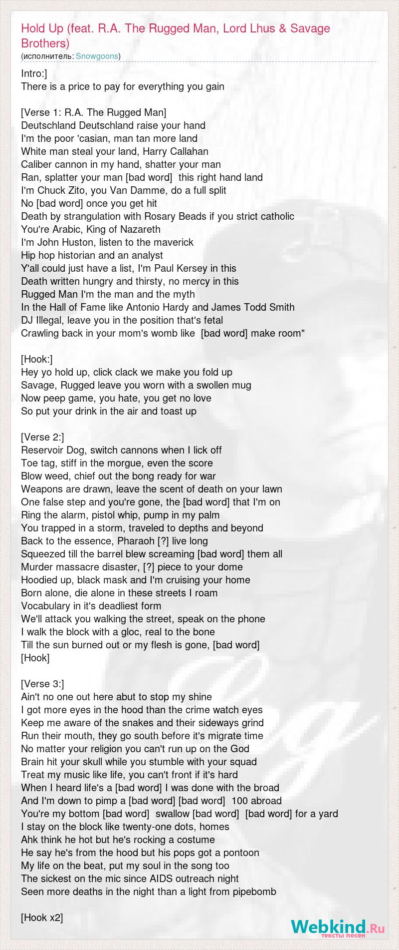 А как ты думаешь, о чем песня "Hold Up (feat. R.A. The Rugged Man, Lord Lhus & Savage Brothers)" ?