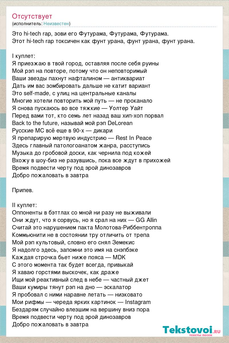 Это hi-tech rap, зови его Футурама, Футурама, Футурама. Этот hi-tech rap токсичен как фунт урана, фунт урана, фунт урана. I куплет: Я приезжаю в твой город, оставляя после себя руины Мой рэп на повторе, потому что он неповторимый Ваши звезды пахнут нафталином — антиквариат Дать им вас зомбировать дальше не катит вариант Это self-made, с улиц на центральные каналы Многие хотели повторить мой путь — не проканало Я снова пускаюсь во все тяжкие — Уолтер Уайт Перед вами тот, кто семь лет назад ваш хип-хоп порвал Back to the future, называй мой рэп DeLorean Русские MC всё еще в 90-х — дикари Я препарирую мертвую индустрию — Rest In Peace Здесь главный патологоанатом жанра, расступись Музыка до гробовой доски, как чернила под кожей Вхожу в шоу-биз не разувшись, пока все ждут в прихожей Время подвести черту под эрой динозавров Добро пожаловать в завтра Припев. II куплет: Оппоненты в бэттлах со мной ни разу не выживали Они ждут, что я сорвусь, но я срал на них — GG Allin Считай это нарушением пакта Молотова-Риббентроппа Коммьюнити не в состоянии тру отличить от трепа Мой рэп культовый, словно его снял Земекис Я надолго здесь, запомни это имя на снэпбэке Каждая строчка бьет ниже пояса — MDK С этого момента так будет всегда, привыкай Я хаваю горстями выскочек, как драже Ищи мой реактивный след в небе — частный джет Ваши кумиры тянут рэп на дно — эскалатор Я пробовал с ними наравне летать — низковато Мои рифмы — череда ярких картинок — Instagram Бездарям случайно влезшим на вершину вниз пора Время подвести черту под эрой динозавров Добро пожаловать в завтра