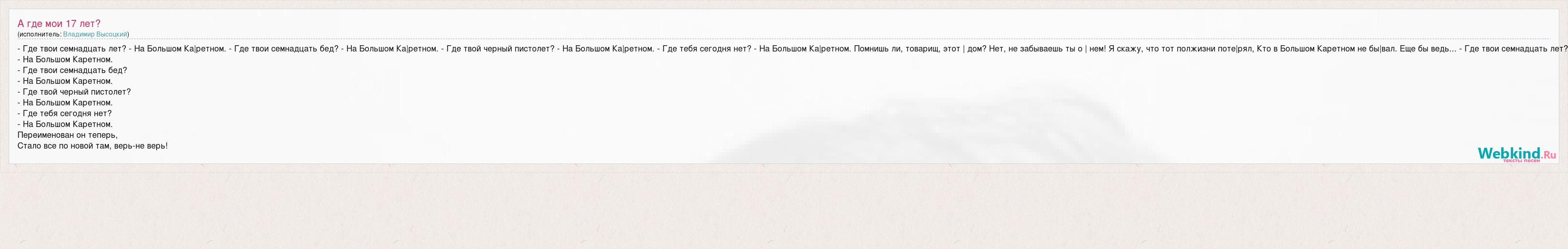 - Где твои семнадцать лет? - На Большом Ка|ретном. - Где твои семнадцать бед? - На Большом Ка|ретном. - Где твой черный пистолет? - На Большом Ка|ретном. - Где тебя сегодня нет? - На Большом Ка|ретном. Помнишь ли, товарищ, этот | дом? Нет, не забываешь ты о | нем! Я скажу, что тот полжизни поте|рял, Кто в Большом Каретном не бы|вал. Еще бы ведь... - Где твои семнадцать лет? - На Большом Каретном. - Где твои семнадцать бед? - На Большом Каретном. - Где твой черный пистолет? - На Большом Каретном. - Где тебя сегодня нет? - На Большом Каретном. Переименован он теперь, Стало все по новой там, верь-не верь!