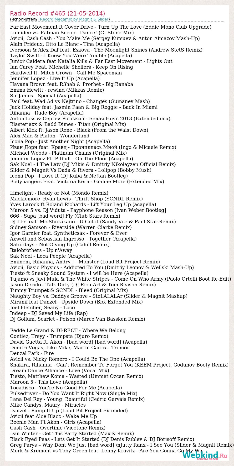 Far East Movement ft Cover Drive - Turn Up The Love (Eddie Mono Club Upgrade) Lumidee vs. Fatman Scoop - Dance! (CJ Stone Mix) Avicii, Cash Cash - You Make Me (Sergey Kutsuev & Anton Almazov Mash-Up) Alain Prideux, Otto Le Blanc - Tina (Acapella) Iversoon & Alex Daf feat. Eskova - The Moonlight Shines (Andrew StetS Remix) Taylor Swift - I Knew You Were Trouble (Acapella) Junior Caldera feat Natalia Kills & Far East Movement - Lights Out Ian Carey Feat. Michelle Shellers - Keep On Rising Hardwell ft. Mitch Crown - Call Me Spaceman Jennifer Lopez - Live It Up (Acapella) Havana Brown feat. R3hab & Prorhet - Big Banaba Emma Hewitt - rewind (Mikkas Remix) Sir James - Special (Acapella) Faul feat. Wad Ad vs Nejtrino - Changes (Gumanev Mash) Jack Holiday feat. Jasmin Paan & Big Reggie - Back In Miami Rihanna - Rude Boy (Acapella) Anton Liss & Сергей Рогожин - Белая Ночь 2013 (Extended mix) Blasterjaxx & Badd Dimes - Titan (Original Mix) Albert Kick ft. Jason Rene - Black (From the Waist Down) Alex Mad & Platon - Wonderland Icona Pop - Just Another Night (Acapella) Иван Дорн feat. Кравц - Прониклась Мной (Ingo & Micaele Remix) Michael Woods - Platinum Chains (Original Mix) Jennifer Lopez Ft. Pitbull - On The Floor (Acapella) Sak Noel - I The Law (DJ Mikis & Dmitriy Nikolayzen Official Remix) Slider & Magnit Vs Dada & Rivera - Lolipop (Bobby Mush) Icona Pop - I Love It (DJ Kuba & Ne!tan Bootleg) Bodybangers Feat. Victoria Kern - Gimme More (Extended Mix) Limelight - Ready or Not (Mondo Remix) Macklemore Ryan Lewis - Thrift Shop (SCNDL Remix) Yves Larock ft Roland Richards - Lift Your Leg Up (acapella) Maroon 5 vs. Dj Viduta - Payphone Reason [Ivan Weber Bootleg] 666 - Supa [bad word] Fly (Club Stars Remix) DJ Lbr feat. Mc Shurakano - U Got it (Sandy Vee & Paul Srar Remix) Sidney Samson - Riverside (Warren Clarke Remix) Igor Garnier feat. Syntheticsax - Forever & Ever Axwell and Sebastian Ingrosso - Together (Acapella) Saturdays - Not Giving Up (Cahill Remix) Italobrothers - Up'n'Away Sak Noel - Loca People (Acapella) Eminem, Rihanna, Andry J - Monster (Loud Bit Project Remix) Avicii, Basic Physics - Addicted To You (Dmitriy Leonov & Wellski Mash-Up) Tiesto ft Sneaky Sound System - I will be Here (Acapella) Tujamo vs Javi Mula & The White Stripes - Come On Who Army (Paolo Ortelli Boot Re-Edit) Jason Derulo - Talk Dirty (DJ Rich-Art & Tom Reason Remix) Timmy Trumpet & SCNDL - Bleed (Original Mix) Naughty Boy vs. Daddys Groove - SteLALALAr (Slider & Magnit Mashup) Mirami feat Danzel - Upside Down (Bbx Extended Mix) Joel Fletcher, Seany - Loco Indeep - DJ Saved My Life (Rap) DJ Gollum, Scarlet - Poison (Marco Van Bassken Remix) Fedde Le Grand & DI-RECT - Where We Belong Contiez, Treyy - Trumpsta (Djuro Remix) David Guetta ft. Akon - [bad word] [bad word] (Acapella) Dimitri Vegas, Like Mike, Martin Garrix - Tremor Denzal Park - Fire Avicii vs. Nicky Romero - I Could Be The One (Acapella) Shakira, Rihanna - Can't Remember To Forget You (KEEM Project, Godunov Booty Remix) Dream Dance Alliance - Love (Vocal Mix) Tiesto, Matthew Koma - Wasted (Ummet Ozcan Remix) Maroon 5 - This Love (Acapella) Tocadisco - You're No Good For Me (Acapella) Pulsedriver - Do You Want It Right Now (Single Mix) Lana Del Rey - Young Beautiful (Cedric Gervais Remix) Mike Candys, Maury - Miracles Danzel - Pump It Up (Loud Bit Project Extended) Avicii feat Aloe Blacc - Wake Me Up Beenie Man Ft Akon - Girls (Acapella) Cash Cash - Overtime (Vicetone Remix) Dan Winter - Get This Party Started (Max K Remix) Black Eyed Peas - Lets Get It Started (DJ Denis Rublev & DJ Borisoff Remix) Greg Parys – Why Dont We Just [bad word] \nJutty Ranx - I See You (Slider & Magnit Remix) Merk & Kremont vs Toby Green feat. Lenny Kravitz - Are You Gonna Go My Wa