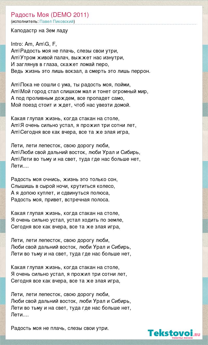 Каподастр на 3ем ладу Intro: Am, Am\G, F, Am\Радость моя не плачь, слезы свои утри, Am\Утром живой палач, выжжет нас изнутри, И заглянув в глаза, скажет ломай перо, Ведь жизнь это лишь вокзал, а смерть это лишь перрон. Am\Пока не сошли с ума, ты радость моя, пойми, Am\Мой город стал слишком мал и тонет огромный мир, А под проливным дождем, все пропадет само, Мой поезд стоит и ждет, чтоб нас увезти домой. Какая глупая жизнь, когда стакан на столе, Am\Я очень сильно устал, я прожил три сотни лет, Am\Сегодня все как вчера, все та же злая игра, Лети, лети лепесток, свою дорогу люби, Am\Люби свой дальний восток, люби Урал и Сибирь, Am\Лети во тьму и на свет, туда где нас больше нет, Лети.... Радость моя очнись, жизнь это только сон, Слышишь в сырой ночи, крутиться колесо, А я допою куплет, и сдвинуться полюса, Радость моя, привет, встречная полоса. Какая глупая жизнь, когда стакан на столе, Я очень сильно устал, устал ходить по земле, Сегодня все как вчера, все та же злая игра, Лети, лети лепесток, свою дорогу люби, Люби свой дальний восток, люби Урал и Сибирь, Лети во тьму и на свет, туда где нас больше нет, Какая глупая жизнь, когда стакан на столе, Я очень сильно устал, я прожил три сотни лет, Сегодня все как вчера, все та же злая игра, Лети, лети лепесток, свою дорогу люби, Люби свой дальний восток, люби Урал и Сибирь, Лети во тьму и на свет, туда где нас больше нет, Лети.... Радость моя не плачь, слезы свои утри.