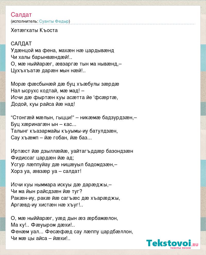 Хетæгкаты Къоста САЛДАТ Удæнцой ма фена, махæн нæ цардывæнд Чи халы барынвæндæй!.. О, мæ ныййарæг, æвзаргæ тын ма нывæнд,– Цухъхъатæ дарæн мын нæй!.. Морæ фæсбынæй дæ буц хъæбулы зæрдæ Нал ысрухс кодтай, мæ мад! – Исчи дæ фыртæн куы асæтта йе 'фсæртæ, Додой, куы райса йæ над! “Стонгæй мæлын, гыцци!” – никæмæ бадзурдзæн,– Буц хæринагæн ын – кас... Талынг къазармайы къуымы-иу батулдзæн, Сау хъæмп – йæ гобан, йæ баз... Иртæст йæ дзыллæйæ, уайтагъддæр базондзæн Фидиссаг цардæн йæ ад; Усгур лæппуйау дæ ницæуыл бадомдзæн,– Хорз уа, æвзæр уа – салдат! Исчи куы ныммара искуы дæ дарæджы,– Чи ма йын райсдзæн йæ туг? Ракæн-иу, ракæ йæ сагъæс дæ хъарæджы, Аргæвд-иу хистæн нæ хъуг!.. О, мæ ныййарæг, уæд дын æз æрбамæлон, Ма ку!.. Фæуыром дæхи!.. Фенæм уал... Фесæфæд сау лæппу цардбæллон, Чи мæ цы айса – йæхи!..
