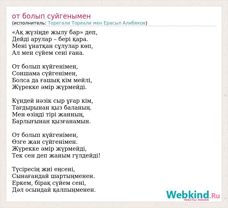 «Ақ жүзіңде жылу бар» деп, Дейді арулар – бері қара. Мені ұнатқан сұлулар көп, Ал мен сүйем сені ғана. От болып күйгенімен, Соншама сүйгенімен, Болса да ғашық кім мейлі, Жүрекке әмір жүрмейді. Күндей нәзік сыр ұғар кім, Тағдырынан қыз баланың. Мен өзіңді тірі жанның, Барлығынан қызғанамын. От болып күйгенімен, Өзге жан сүйгенімен. Жүрекке әмір жүрмейді, Тек сен деп жаным гүлдейді! Түсіресің жиі еңсені, Сынағандай шартыңменен. Еркем, бірақ сүйем сені, Дәл осындай қалпыңменен.