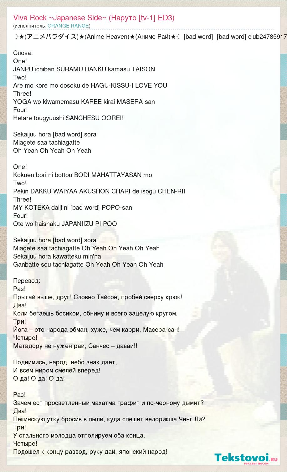 ☽★(アニメパラダイス)★(Anime Heaven)★(Аниме Рай)★☾ [bad word] [bad word] club24785917 Слова: One! JANPU ichiban SURAMU DANKU kamasu TAISON Two! Are mo kore mo dosoku de HAGU-KISSU-I LOVE YOU Three! YOGA wo kiwamemasu KAREE kirai MASERA-san Four! Hetare tougyuushi SANCHESU OOREI! Sekaijuu hora waratteru sora Miagete saa tachiagatte Oh Yeah Oh Yeah Oh Yeah One! Kokuen bori ni bottou BODI MAHATTAYASAN mo Two! Pekin DAKKU WAIYAA AKUSHON CHARI de isogu CHEN-RII Three! MY KOTEKA daiji ni migakiageru POPO-san Four! Ote wo haishaku JAPANIIZU PIIPOO Sekaijuu hora waratteru sora Miagete saa tachiagatte Oh Yeah Oh Yeah Oh Yeah Sekaijuu hora kawatteku min'na Ganbatte sou tachiagatte Oh Yeah Oh Yeah Oh Yeah Перевод: Раз! Прыгай выше, друг! Словно Тайсон, пробей сверху крюк! Два! Коли бегаешь босиком, обниму и всего зацелую кругом. Три! Йога – это народа обман, хуже, чем карри, Масера-сан! Четыре! Матадору не нужен рай, Санчес – давай!! Поднимись, народ, небо знак дает, И всем миром смелей вперед! О да! О да! О да! Раз! Зачем ест просветленный махатма графит и по-черному дымит? Два! Пекинскую утку бросив в пыли, куда спешит велорикша Ченг Ли? Три! У стального молодца отполируем оба конца. Четыре! Подошел к концу развод, руку дай, японский народ!