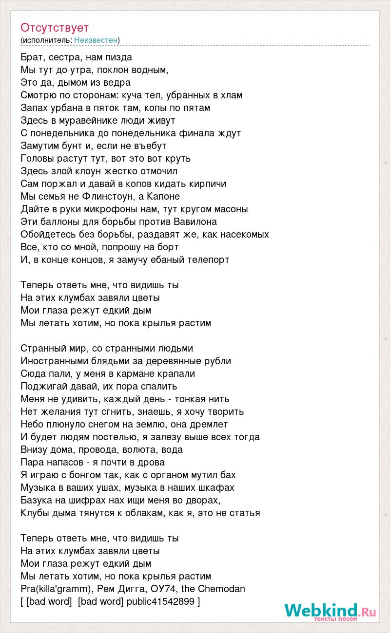 Брат, сестра, нам пизда Мы тут до утра, поклон водным, Это да, дымом из ведра Смотрю по сторонам: куча тел, убранных в хлам Запах урбана в пяток там, копы по пятам Здесь в муравейнике люди живут С понедельника до понедельника финала ждут Замутим бунт и, если не въебут Головы растут тут, вот это вот круть Здесь злой клоун жестко отмочил Сам поржал и давай в копов кидать кирпичи Мы семья не Флинстоун, а Капоне Дайте в руки микрофоны нам, тут кругом масоны Эти баллоны для борьбы против Вавилона Обойдетесь без борьбы, раздавят же, как насекомых Все, кто со мной, попрошу на борт И, в конце концов, я замучу ебаный телепорт Теперь ответь мне, что видишь ты На этих клумбах завяли цветы Мои глаза режут едкий дым Мы летать хотим, но пока крылья растим Странный мир, со странными людьми Иностранными блядьми за деревянные рубли Сюда пали, у меня в кармане крапали Поджигай давай, их пора спалить Меня не удивить, каждый день - тонкая нить Нет желания тут сгнить, знаешь, я хочу творить Небо плюнуло снегом на землю, она дремлет И будет людям постелью, я залезу выше всех тогда Внизу дома, провода, волюта, вода Пара напасов - я почти в дрова Я играю с бонгом так, как с органом мутил бах Музыка в ваших ушах, музыка в наших шкафах Базука на шифрах нах ищи меня во дворах, Клубы дыма тянутся к облакам, как я, это не статья Теперь ответь мне, что видишь ты На этих клумбах завяли цветы Мои глаза режут едкий дым Мы летать хотим, но пока крылья растим Pra(killa'gramm), Рем Дигга, ОУ74, the Chemodan [ [bad word] [bad word] public41542899 ]
