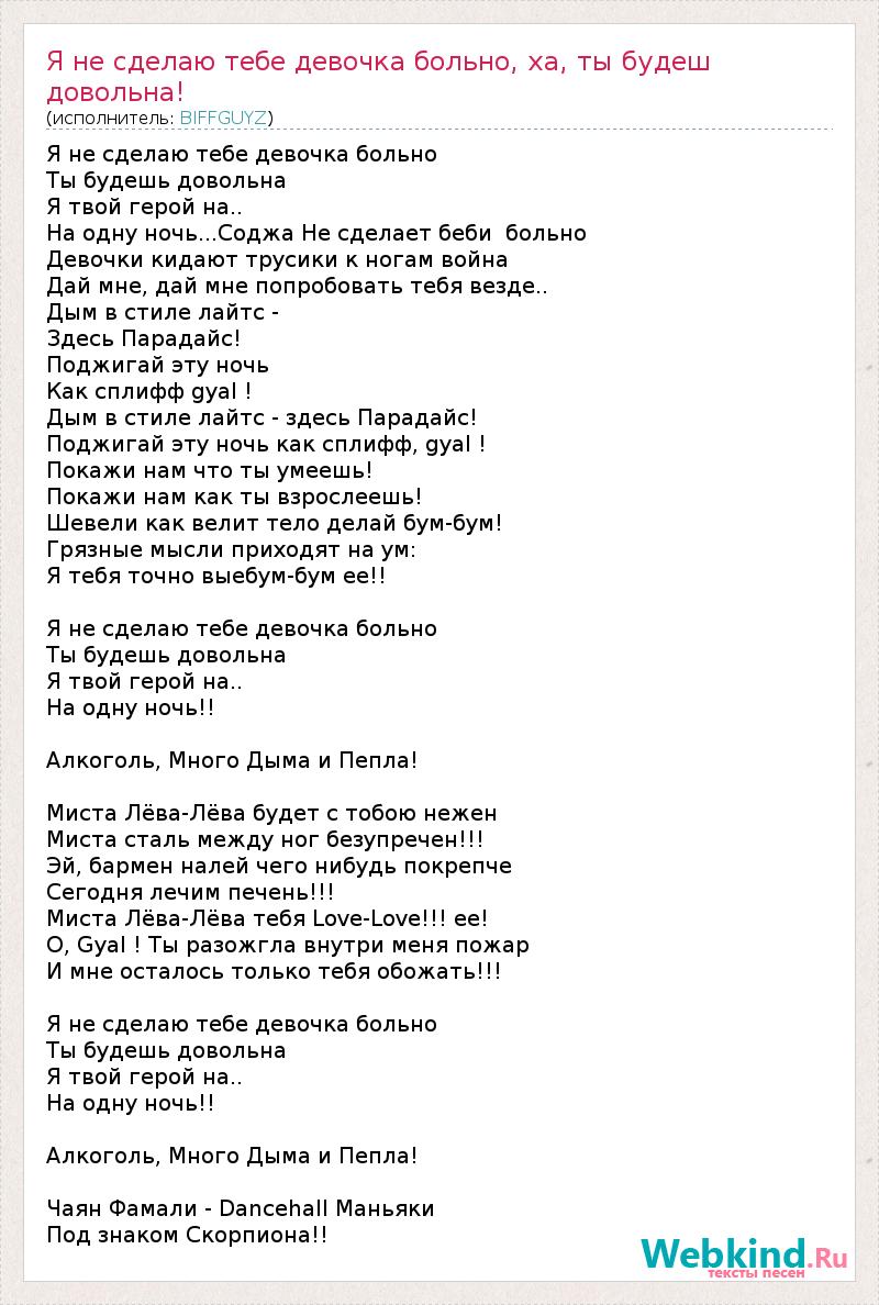 Я не сделаю тебе девочка больно Ты будешь довольна Я твой герой на.. На одну ночь...Соджа Не сделает беби больно Девочки кидают трусики к ногам война Дай мне, дай мне попробовать тебя везде.. Дым в стиле лайтс - Здесь Парадайс! Поджигай эту ночь Как сплифф gyal ! Дым в стиле лайтс - здесь Парадайс! Поджигай эту ночь как сплифф, gyal ! Покажи нам что ты умеешь! Покажи нам как ты взрослеешь! Шевели как велит тело делай бум-бум! Грязные мысли приходят на ум: Я тебя точно выебум-бум ее!! Я не сделаю тебе девочка больно Ты будешь довольна Я твой герой на.. На одну ночь!! Алкоголь, Много Дыма и Пепла! Миста Лёва-Лёва будет с тобою нежен Миста сталь между ног безупречен!!! Эй, бармен налей чего нибудь покрепче Сегодня лечим печень!!! Миста Лёва-Лёва тебя Love-Love!!! ее! O, Gyal ! Ты разожгла внутри меня пожар И мне осталось только тебя обожать!!! Я не сделаю тебе девочка больно Ты будешь довольна Я твой герой на.. На одну ночь!! Алкоголь, Много Дыма и Пепла! Чаян Фамали - Dancehall Маньяки Под знаком Скорпиона!!