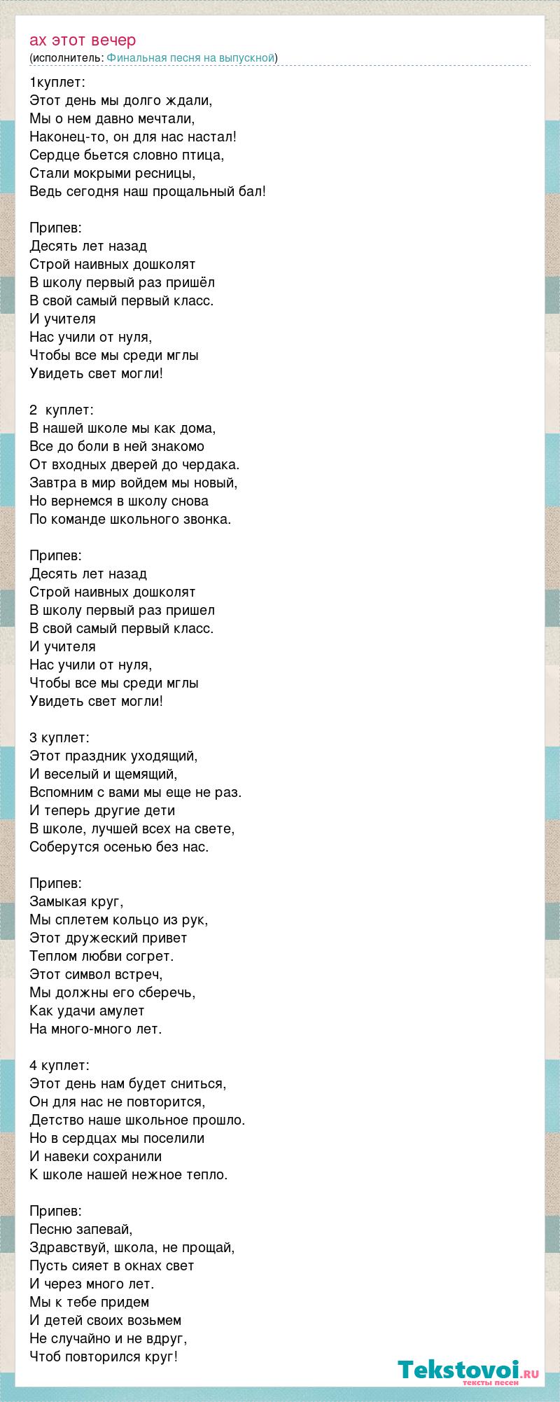 1куплет: Этот день мы долго ждали, Мы о нем давно мечтали, Наконец-то, он для нас настал! Сердце бьется словно птица, Стали мокрыми ресницы, Ведь сегодня наш прощальный бал! Припев: Десять лет назад Строй наивных дошколят В школу первый раз пришёл В свой самый первый класс. И учителя Нас учили от нуля, Чтобы все мы среди мглы Увидеть свет могли! 2 куплет: В нашей школе мы как дома, Все до боли в ней знакомо От входных дверей до чердака. Завтра в мир войдем мы новый, Но вернемся в школу снова По команде школьного звонка. Припев: Десять лет назад Строй наивных дошколят В школу первый раз пришел В свой самый первый класс. И учителя Нас учили от нуля, Чтобы все мы среди мглы Увидеть свет могли! 3 куплет: Этот праздник уходящий, И веселый и щемящий, Вспомним с вами мы еще не раз. И теперь другие дети В школе, лучшей всех на свете, Соберутся осенью без нас. Припев: Замыкая круг, Мы сплетем кольцо из рук, Этот дружеский привет Теплом любви согрет. Этот символ встреч, Мы должны его сберечь, Как удачи амулет На много-много лет. 4 куплет: Этот день нам будет сниться, Он для нас не повторится, Детство наше школьное прошло. Но в сердцах мы поселили И навеки сохранили К школе нашей нежное тепло. Припев: Песню запевай, Здравствуй, школа, не прощай, Пусть сияет в окнах свет И через много лет. Мы к тебе придем И детей своих возьмем Не случайно и не вдруг, Чтоб повторился круг!