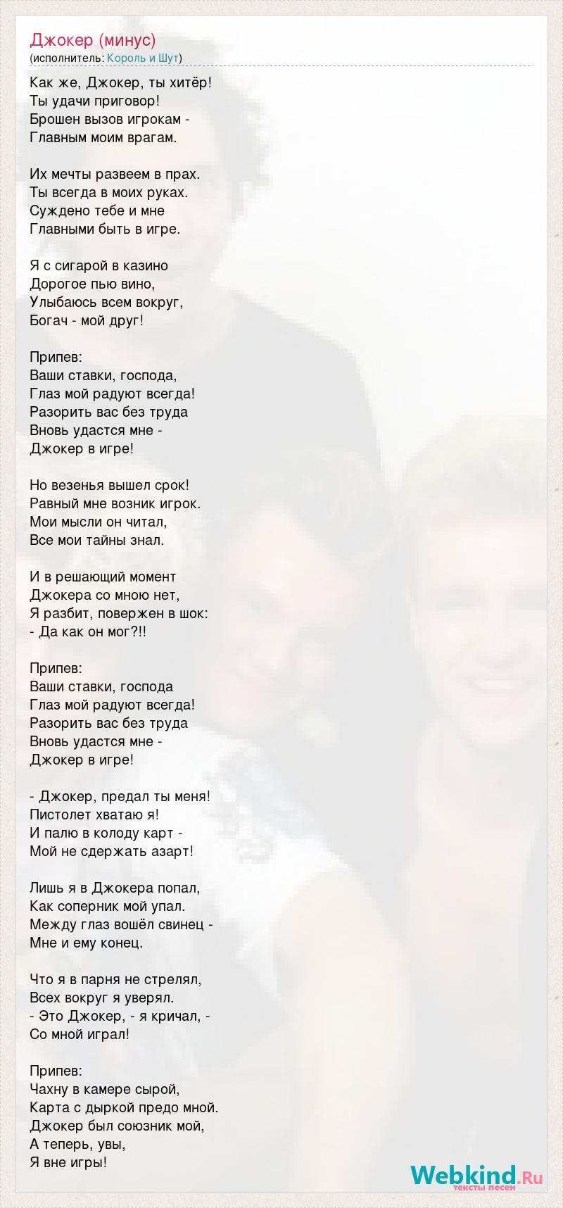 Как же, Джокер, ты хитёр! Ты удачи приговор! Брошен вызов игрокам - Главным моим врагам. Их мечты развеем в прах. Ты всегда в моих руках. Суждено тебе и мне Главными быть в игре. Я с сигарой в казино Дорогое пью вино, Улыбаюсь всем вокруг, Богач - мой друг! Припев: Ваши ставки, господа, Глаз мой радуют всегда! Разорить вас без труда Вновь удастся мне - Джокер в игре! Но везенья вышел срок! Равный мне возник игрок. Мои мысли он читал, Все мои тайны знал. И в решающий момент Джокера со мною нет, Я разбит, повержен в шок: - Да как он мог?!! Припев: Ваши ставки, господа Глаз мой радуют всегда! Разорить вас без труда Вновь удастся мне - Джокер в игре! - Джокер, предал ты меня! Пистолет хватаю я! И палю в колоду карт - Мой не сдержать азарт! Лишь я в Джокера попал, Как соперник мой упал. Между глаз вошёл свинец - Мне и ему конец. Что я в парня не стрелял, Всех вокруг я уверял. - Это Джокер, - я кричал, - Со мной играл! Припев: Чахну в камере сырой, Карта с дыркой предо мной. Джокер был союзник мой, А теперь, увы, Я вне игры!