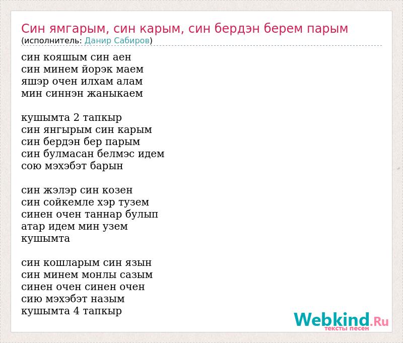 син кояшым син аен син минем йорэк маем яшэр очен илхам алам мин синнэн жаныкаем кушымта 2 тапкыр син янгырым син карым син бердэн бер парым син булмасан белмэс идем сою мэхэбэт барын син жэлэр син козен син сойкемле хэр тузем синен очен таннар булып атар идем мин узем кушымта син кошларым син язын син минем монлы сазым синен очен синен очен сию мэхэбэт назым кушымта 4 тапкыр