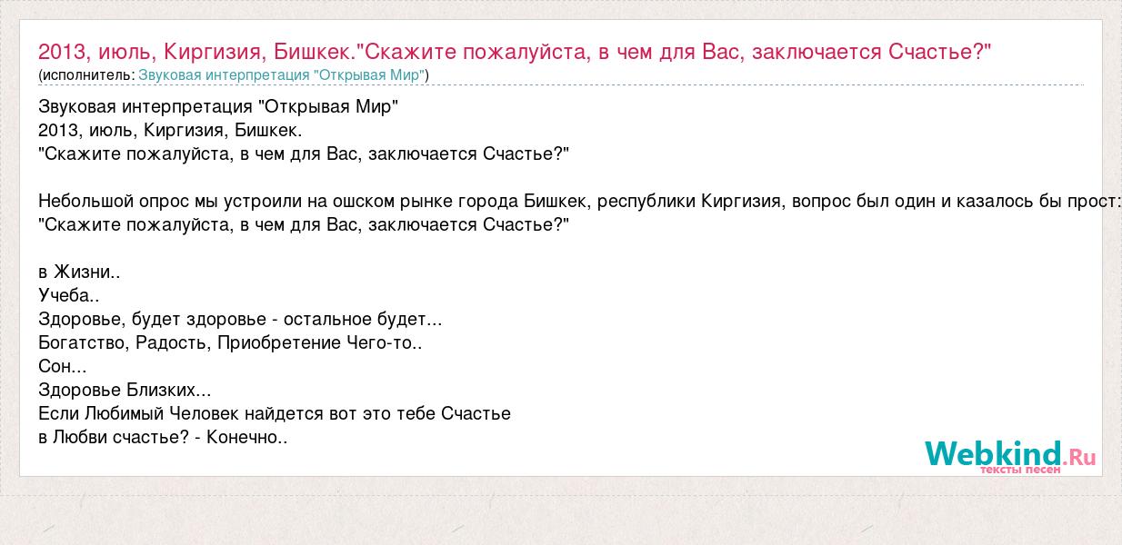 А как ты думаешь, о чем песня "2013, июль, Киргизия, Бишкек."Скажите пожалуйста, в чем для Вас, заключается Сча" ?