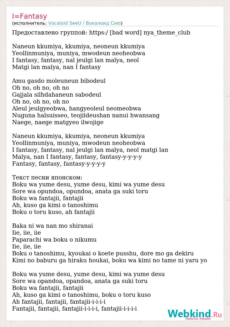 Предоставлено группой: https:/ [bad word] nya_theme_club Naneun kkumiya, kkumiya, neoneun kkumiya Yeollinmuniya, muniya, mwodeun neoheobwa I fantasy, fantasy, nal jeulgi lan malya, neol Matgi lan malya, nan I fantasy Amu gasdo moleuneun bibodeul Oh no, oh no, oh no Gajjala silhdahaneun sabodeul Oh no, oh no, oh no Aleul jeulgyeobwa, hangyeoleul neomeobwa Nuguna halsuisseo, teojildeushan nanui hwansang Naege, naege matgyeo ilwojige Naneun kkumiya, kkumiya, neoneun kkumiya Yeollinmuniya, muniya, mwodeun neoheobwa I fantasy, fantasy, nal jeulgi lan malya, neol matgi lan Malya, nan I fantasy, fantasy, fantasy-y-y-y-y Fantasy, fantasy, fantasy-y-y-y-y Текст песни японском: Boku wa yume desu, yume desu, kimi wa yume desu Sore wa opundoa, opundoa, anata ga suki toru Boku wa fantajii, fantajii Ah, kuso ga kimi o tanoshimu Boku o toru kuso, ah fantajii Baka ni wa nan mo shiranai Iie, iie, iie Paparachi wa boku o nikumu Iie, iie, iie Boku o tanoshimu, kyoukai o koete pusshu, dore mo ga dekiru Kimi no baburu ga hiraku houkai, boku wa kimi no tame ni yaru yo Boku wa yume desu, yume desu, kimi wa yume desu Sore wa opandoa, opandoa, anata ga suki toru Boku wa fantajii, fantajii Ah, kuso ga kimi o tanoshimu, boku o toru kuso Ah fantajii, fantajii, fantajii-i-i-i-i Fantajii, fantajii, fantajii-i-i-i-i, fantajii-i-i-i-i