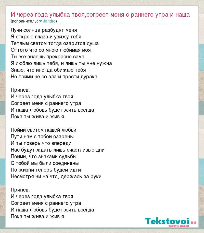 Лучи солнца разбудят меня Я открою глаза и увижу тебя Теплым светом тогда озарится душа Оттого что со мною любимая моя Ты же знаешь прекрасно сама Я люблю лишь тебя, и лишь ты мне нужна Знаю, что иногда обижаю тебя Но пойми не со зла и прости дурака Припев: И через года улыбка твоя Согреет меня с раннего утра И наша любовь будет жить всегда Пока ты жива и жив я. Пойми светом нашей любви Пути нам с тобой озарены И ты поверь что впереди Нас будут ждать лишь счастливые дни Пойми, что знаками судьбы С тобой мы были соединены По жизни теперь будем идти Несмотря ни на что, держась за руки Припев: И через года улыбка твоя Согреет меня с раннего утра И наша любовь будет жить всегда Пока ты жива и жив я.