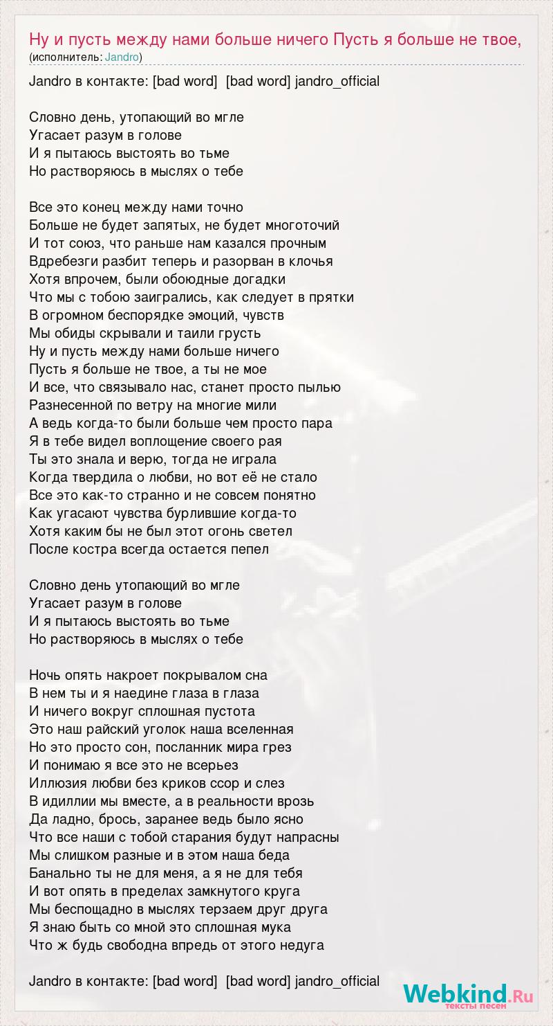 Jandro в контакте: [bad word] [bad word] jandro_official Словно день, утопающий во мгле Угасает разум в голове И я пытаюсь выстоять во тьме Но растворяюсь в мыслях о тебе Все это конец между нами точно Больше не будет запятых, не будет многоточий И тот союз, что раньше нам казался прочным Вдребезги разбит теперь и разорван в клочья Хотя впрочем, были обоюдные догадки Что мы с тобою заигрались, как следует в прятки В огромном беспорядке эмоций, чувств Мы обиды скрывали и таили грусть Ну и пусть между нами больше ничего Пусть я больше не твое, а ты не мое И все, что связывало нас, станет просто пылью Разнесенной по ветру на многие мили А ведь когда-то были больше чем просто пара Я в тебе видел воплощение своего рая Ты это знала и верю, тогда не играла Когда твердила о любви, но вот её не стало Все это как-то странно и не совсем понятно Как угасают чувства бурлившие когда-то Хотя каким бы не был этот огонь светел После костра всегда остается пепел Словно день утопающий во мгле Угасает разум в голове И я пытаюсь выстоять во тьме Но растворяюсь в мыслях о тебе Ночь опять накроет покрывалом сна В нем ты и я наедине глаза в глаза И ничего вокруг сплошная пустота Это наш райский уголок наша вселенная Но это просто сон, посланник мира грез И понимаю я все это не всерьез Иллюзия любви без криков ссор и слез В идиллии мы вместе, а в реальности врозь Да ладно, брось, заранее ведь было ясно Что все наши с тобой старания будут напрасны Мы слишком разные и в этом наша беда Банально ты не для меня, а я не для тебя И вот опять в пределах замкнутого круга Мы беспощадно в мыслях терзаем друг друга Я знаю быть со мной это сплошная мука Что ж будь свободна впредь от этого недуга Jandro в контакте: [bad word] [bad word] jandro_official
