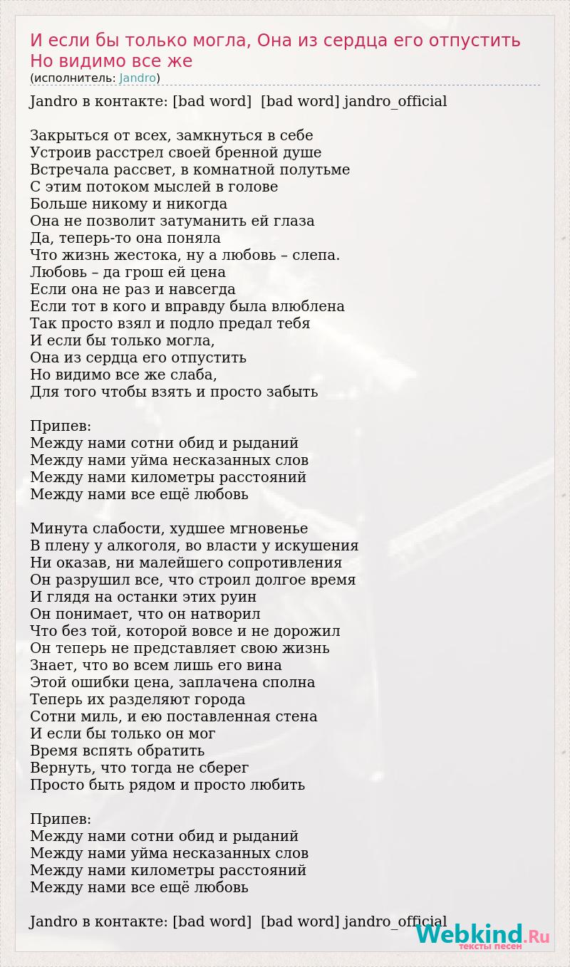 Jandro в контакте: [bad word] [bad word] jandro_official Закрыться от всех, замкнуться в себе Устроив расстрел своей бренной душе Встречала рассвет, в комнатной полутьме С этим потоком мыслей в голове Больше никому и никогда Она не позволит затуманить ей глаза Да, теперь-то она поняла Что жизнь жестока, ну а любовь – слепа. Любовь – да грош ей цена Если она не раз и навсегда Если тот в кого и вправду была влюблена Так просто взял и подло предал тебя И если бы только могла, Она из сердца его отпустить Но видимо все же слаба, Для того чтобы взять и просто забыть Припев: Между нами сотни обид и рыданий Между нами уйма несказанных слов Между нами километры расстояний Между нами все ещё любовь Минута слабости, худшее мгновенье В плену у алкоголя, во власти у искушения Ни оказав, ни малейшего сопротивления Он разрушил все, что строил долгое время И глядя на останки этих руин Он понимает, что он натворил Что без той, которой вовсе и не дорожил Он теперь не представляет свою жизнь Знает, что во всем лишь его вина Этой ошибки цена, заплачена сполна Теперь их разделяют города Сотни миль, и ею поставленная стена И если бы только он мог Время вспять обратить Вернуть, что тогда не сберег Просто быть рядом и просто любить Припев: Между нами сотни обид и рыданий Между нами уйма несказанных слов Между нами километры расстояний Между нами все ещё любовь Jandro в контакте: [bad word] [bad word] jandro_official