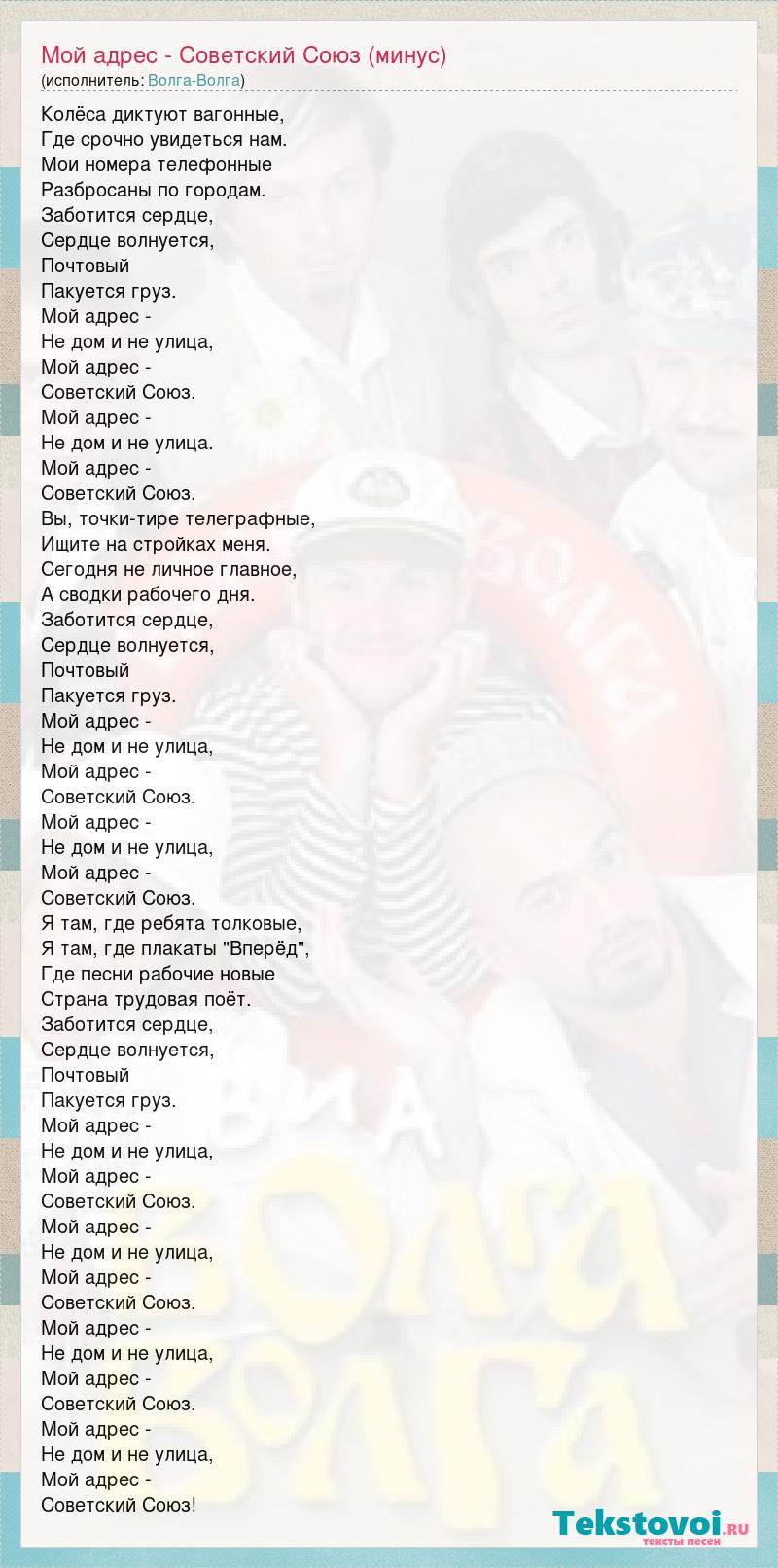 Колёса диктуют вагонные, Где срочно увидеться нам. Мои номера телефонные Разбросаны по городам. Заботится сердце, Сердце волнуется, Почтовый Пакуется груз. Мой адрес - Не дом и не улица, Мой адрес - Советский Союз. Мой адрес - Не дом и не улица. Мой адрес - Советский Союз. Вы, точки-тире телеграфные, Ищите на стройках меня. Сегодня не личное главное, А сводки рабочего дня. Заботится сердце, Сердце волнуется, Почтовый Пакуется груз. Мой адрес - Не дом и не улица, Мой адрес - Советский Союз. Мой адрес - Не дом и не улица, Мой адрес - Советский Союз. Я там, где ребята толковые, Я там, где плакаты "Вперёд", Где песни рабочие новые Страна трудовая поёт. Заботится сердце, Сердце волнуется, Почтовый Пакуется груз. Мой адрес - Не дом и не улица, Мой адрес - Советский Союз. Мой адрес - Не дом и не улица, Мой адрес - Советский Союз. Мой адрес - Не дом и не улица, Мой адрес - Советский Союз. Мой адрес - Не дом и не улица, Мой адрес - Советский Союз!
