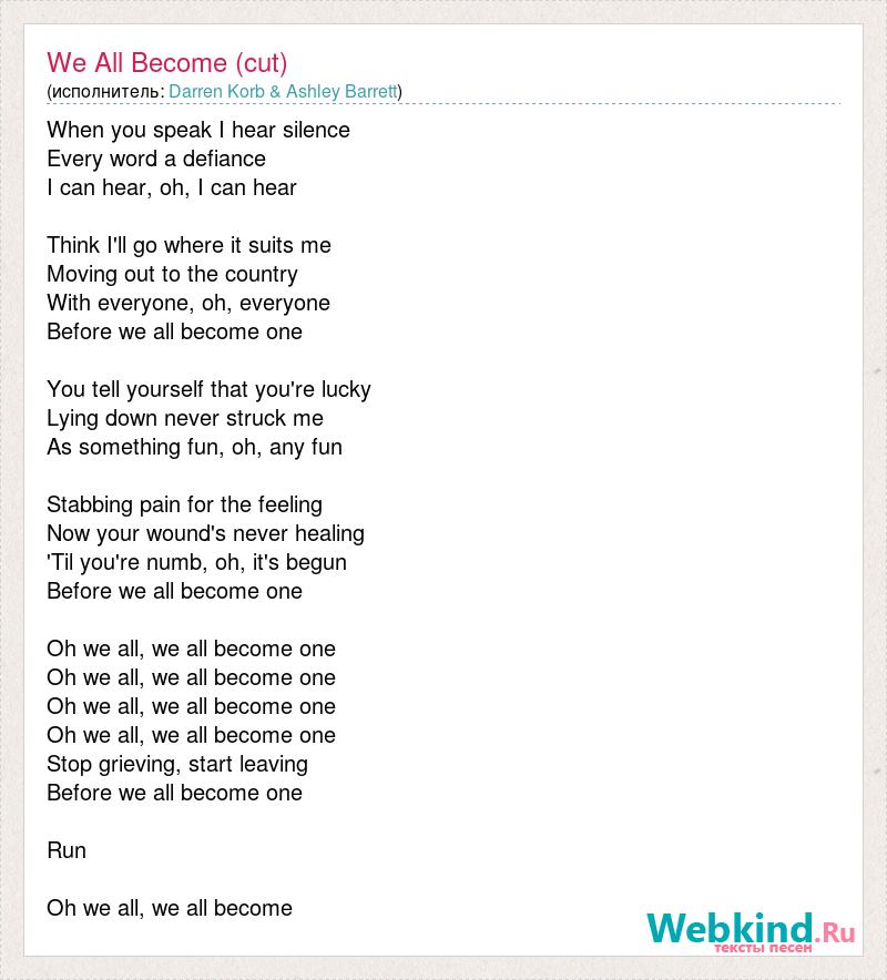When you speak I hear silence Every word a defiance I can hear, oh, I can hear Think I'll go where it suits me Moving out to the country With everyone, oh, everyone Before we all become one You tell yourself that you're lucky Lying down never struck me As something fun, oh, any fun Stabbing pain for the feeling Now your wound's never healing 'Til you're numb, oh, it's begun Before we all become one Oh we all, we all become one Oh we all, we all become one Oh we all, we all become one Oh we all, we all become one Stop grieving, start leaving Before we all become one Run Oh we all, we all become