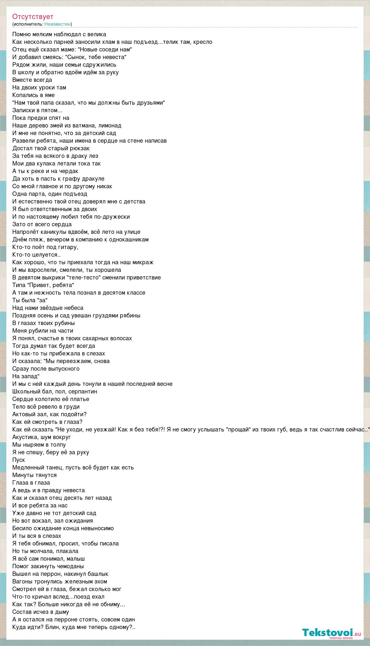 Помню мелким наблюдал с велика Как несколько парней заносили хлам в наш подъезд...телик там, кресло Отец ещё сказал маме: "Новые соседи нам" И добавил смеясь: "Сынок, тебе невеста" Рядом жили, наши семьи сдружились В школу и обратно вдоём идём за руку Вместе всегда На двоих уроки там Копались в яме "Нам твой папа сказал, что мы должны быть друзьями" Записки в пятом... Пока предки спят на Наше дерево змей из ватмана, лимонад И мне не понятно, что за детский сад Развели ребята, наши имена в сердце на стене написав Достал твой старый рюкзак За тебя на всякого в драку лез Мои два кулака летали тока так А ты к реке и на чердак Да хоть в пасть к графу дракуле Со мной главное и по другому никак Одна парта, один подъезд И естественно твой отец доверял мне с детства Я был ответственным за двоих И по настоящему любил тебя по-дружески Зато от всего сердца Напролёт каникулы вдвоём, всё лето на улице Днём пляж, вечером в компанию к однокашникам Кто-то поёт под гитару, Кто-то целуется.. Как хорошо, что ты приехала тогда на наш микраж И мы взрослели, смелели, ты хорошела В девятом выкрики "теле-тесто" сменили приветствие Типа "Привет, ребята" А там и нежность тела познал в десятом классе Ты была "за" Над нами звёздые небеса Поздняя осень и сад увешан груздями рябины В глазах твоих рубины Меня рубили на части Я понял, счастье в твоих сахарных волосах Тогда думал так будет всегда Но как-то ты прибежала в слезах И сказала: "Мы переезжаем, снова Сразу после выпускного На запад" И мы с ней каждый день тонули в нашей последней весне Школьный бал, пол, серпантин Сердце колотило её платье Тело всё ревело в груди Актовый зал, как подойти? Как ей смотреть в глаза? Как ей сказать "Не уходи, не уезжай! Как я без тебя!?! Я не смогу услышать "прощай" из твоих губ, ведь я так счастлив сейчас.." Акустика, шум вокруг Мы ныряем в толпу Я не спешу, беру её за руку Пуск Медленный танец, пусть всё будет как есть Минуты тянутся Глаза в глаза А ведь и в правду невеста Как и сказал отец десять лет назад И все ребята за нас Уже давно не тот детский сад Но вот вокзал, зал ожидания Бесило ожидание конца невыносимо И ты вся в слезах Я тебя обнимал, просил, чтобы писала Но ты молчала, плакала Я всё сам понимал, малыш Помог закинуть чемоданы Вышел на перрон, накинул башлык Вагоны тронулись железным эхом Смотрел ей в глаза, бежал сколько мог Что-то кричал вслед...поезд ехал Как так? Больше никогда её не обниму... Состав исчез в дыму А я остался на перроне стоять, совсем один Куда идти? Блин, куда мне теперь одному?..