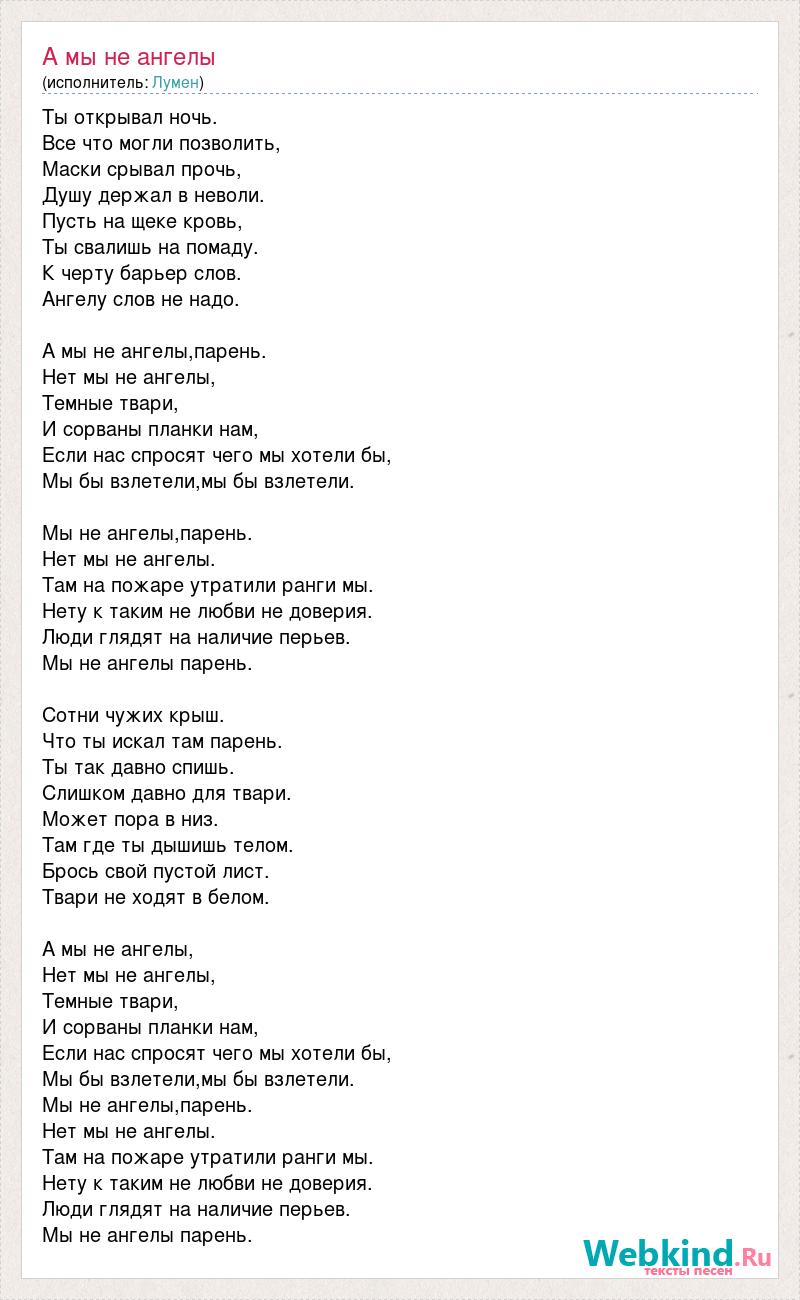 Ты открывал ночь. Все что могли позволить, Маски срывал прочь, Душу держал в неволи. Пусть на щеке кровь, Ты свалишь на помаду. К черту барьер слов. Ангелу слов не надо. А мы не ангелы,парень. Нет мы не ангелы, Темные твари, И сорваны планки нам, Если нас спросят чего мы хотели бы, Мы бы взлетели,мы бы взлетели. Мы не ангелы,парень. Нет мы не ангелы. Там на пожаре утратили ранги мы. Нету к таким не любви не доверия. Люди глядят на наличие перьев. Мы не ангелы парень. Сотни чужих крыш. Что ты искал там парень. Ты так давно спишь. Слишком давно для твари. Может пора в низ. Там где ты дышишь телом. Брось свой пустой лист. Твари не ходят в белом. А мы не ангелы, Нет мы не ангелы, Темные твари, И сорваны планки нам, Если нас спросят чего мы хотели бы, Мы бы взлетели,мы бы взлетели. Мы не ангелы,парень. Нет мы не ангелы. Там на пожаре утратили ранги мы. Нету к таким не любви не доверия. Люди глядят на наличие перьев. Мы не ангелы парень.