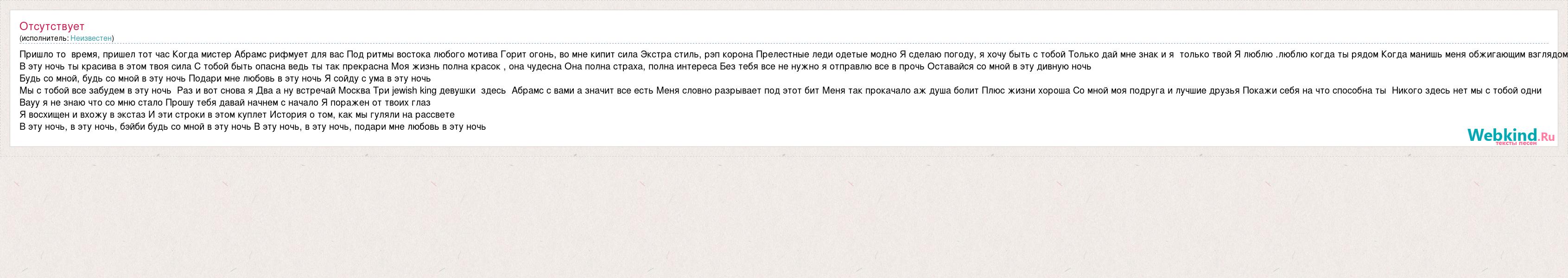 Пришло то время, пришел тот час Когда мистер Абрамс рифмует для вас Под ритмы востока любого мотива Горит огонь, во мне кипит сила Экстра стиль, рэп корона Прелестные леди одетые модно Я сделаю погоду, я хочу быть с тобой Только дай мне знак и я только твой Я люблю .люблю когда ты рядом Когда манишь меня обжигающим взглядом В эту ночь ты красива в этом твоя сила С тобой быть опасна ведь ты так прекрасна Моя жизнь полна красок , она чудесна Она полна страха, полна интереса Без тебя все не нужно я отправлю все в прочь Оставайся со мной в эту дивную ночь Будь со мной, будь со мной в эту ночь Подари мне любовь в эту ночь Я сойду с ума в эту ночь Мы с тобой все забудем в эту ночь Раз и вот снова я Два а ну встречай Москва Три jewish king девушки здесь Абрамс с вами а значит все есть Меня словно разрывает под этот бит Меня так прокачало аж душа болит Плюс жизни хороша Со мной моя подруга и лучшие друзья Покажи себя на что способна ты Никого здесь нет мы с тобой одни Вауу я не знаю что со мню стало Прошу тебя давай начнем с начало Я поражен от твоих глаз Я восхищен и вхожу в экстаз И эти строки в этом куплет История о том, как мы гуляли на рассвете В эту ночь, в эту ночь, бэйби будь со мной в эту ночь В эту ночь, в эту ночь, подари мне любовь в эту ночь