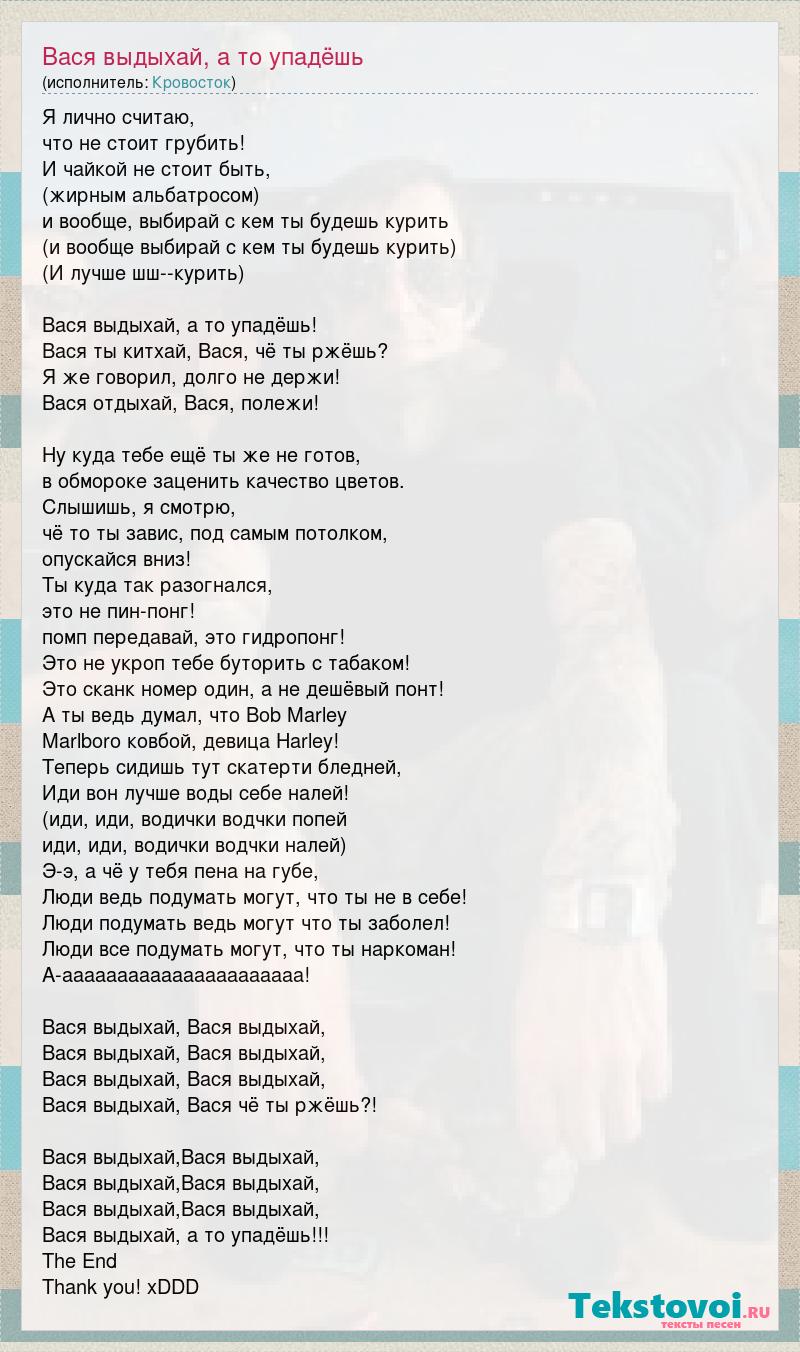 Я лично считаю, что не стоит грубить! И чайкой не стоит быть, (жирным альбатросом) и вообще, выбирай с кем ты будешь курить (и вообще выбирай с кем ты будешь курить) (И лучше шш--курить) Вася выдыхай, а то упадёшь! Вася ты китхай, Вася, чё ты ржёшь? Я же говорил, долго не держи! Вася отдыхай, Вася, полежи! Ну куда тебе ещё ты же не готов, в обмороке заценить качество цветов. Слышишь, я смотрю, чё то ты завис, под самым потолком, опускайся вниз! Ты куда так разогнался, это не пин-понг! помп передавай, это гидропонг! Это не укроп тебе буторить с табаком! Это сканк номер один, а не дешёвый понт! А ты ведь думал, что Bob Marley Marlboro ковбой, девица Harley! Теперь сидишь тут скатерти бледней, Иди вон лучше воды себе налей! (иди, иди, водички водчки попей иди, иди, водички водчки налей) Э-э, а чё у тебя пена на губе, Люди ведь подумать могут, что ты не в себе! Люди подумать ведь могут что ты заболел! Люди все подумать могут, что ты наркоман! А-аааааааааааааааааааааа! Вася выдыхай, Вася выдыхай, Вася выдыхай, Вася выдыхай, Вася выдыхай, Вася выдыхай, Вася выдыхай, Вася чё ты ржёшь?! Вася выдыхай,Вася выдыхай, Вася выдыхай,Вася выдыхай, Вася выдыхай,Вася выдыхай, Вася выдыхай, а то упадёшь!!! The End Thank you! xDDD
