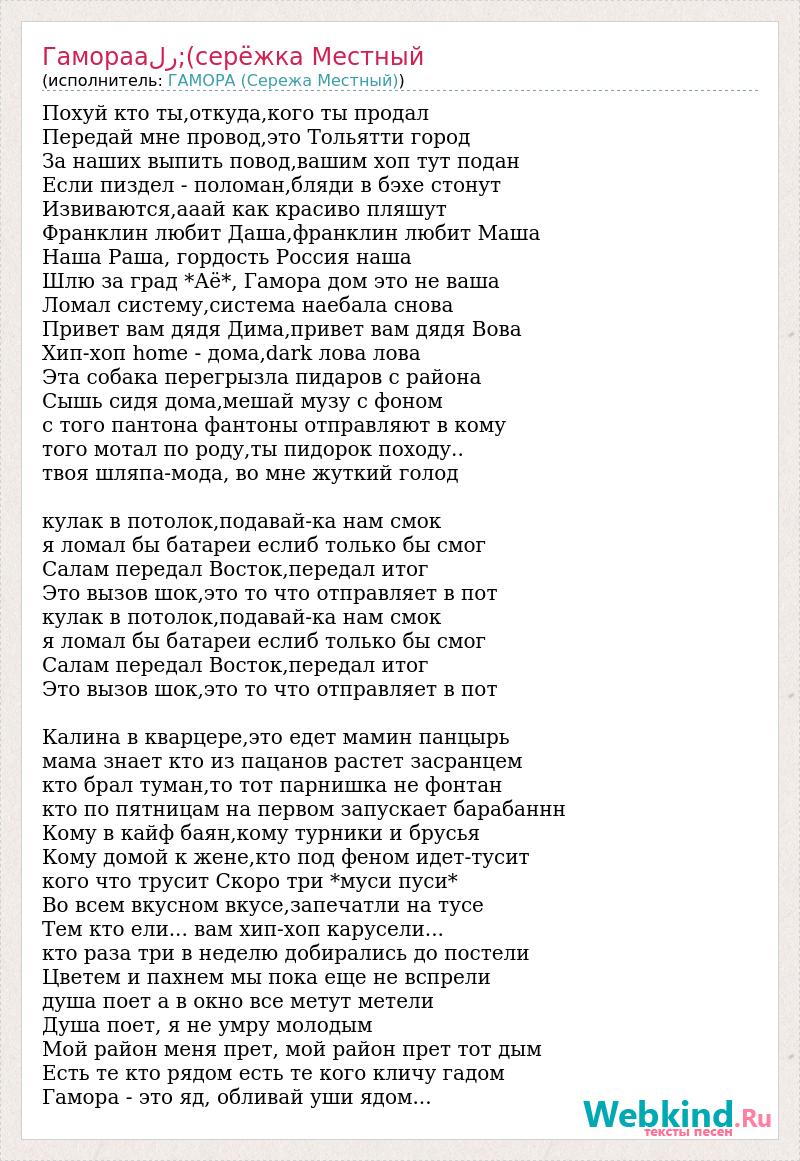 Похуй кто ты,откуда,кого ты продал Передай мне провод,это Тольятти город За наших выпить повод,вашим хоп тут подан Если пиздел - поломан,бляди в бэхе стонут Извиваются,ааай как красиво пляшут Франклин любит Даша,франклин любит Маша Наша Раша, гордость Россия наша Шлю за град *Аё*, Гамора дом это не ваша Ломал систему,система наебала снова Привет вам дядя Дима,привет вам дядя Вова Хип-хоп homе - дома,dark лова лова Эта собака перегрызла пидаров с района Сышь сидя дома,мешай музу с фоном с того пантона фантоны отправляют в кому того мотал по роду,ты пидорок походу.. твоя шляпа-мода, во мне жуткий голод кулак в потолок,подавай-ка нам смок я ломал бы батареи еслиб только бы смог Салам передал Восток,передал итог Это вызов шок,это то что отправляет в пот кулак в потолок,подавай-ка нам смок я ломал бы батареи еслиб только бы смог Салам передал Восток,передал итог Это вызов шок,это то что отправляет в пот Калина в кварцере,это едет мамин панцырь мама знает кто из пацанов растет засранцем кто брал туман,то тот парнишка не фонтан кто по пятницам на первом запускает барабаннн Кому в кайф баян,кому турники и брусья Кому домой к жене,кто под феном идет-тусит кого что трусит Скоро три *муси пуси* Во всем вкусном вкусе,запечатли на тусе Тем кто ели... вам хип-хоп карусели... кто раза три в неделю добирались до постели Цветем и пахнем мы пока еще не вспрели душа поет а в окно все метут метели Душа поет, я не умру молодым Мой район меня прет, мой район прет тот дым Есть те кто рядом есть те кого кличу гадом Гамора - это яд, обливай уши ядом...