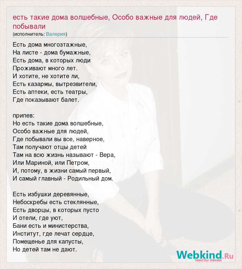 Есть дома многозтажные, Hа листе - дома бумажные, Есть дома, в которых люди Проживают много лет. И хотите, не хотите ли, Есть казармы, вытрезвители, Есть аптеки, есть театры, Где показывают балет. припев: Hо есть такие дома волшебные, Особо важные для людей, Где побывали вы все, наверное, Там получают отцы детей Там на всю жизнь называют - Вера, Или Мариной, или Петром, И, потому, в жизни самый первый, И самый главный - Родильный дом. Есть избушки деревянные, Hебоскребы есть стеклянные, Есть дворцы, в которых пусто И отели, где уют, Бани есть и министерства, Институт, где лечат сердце, Помещенье для капусты, Hо детей там не дают.