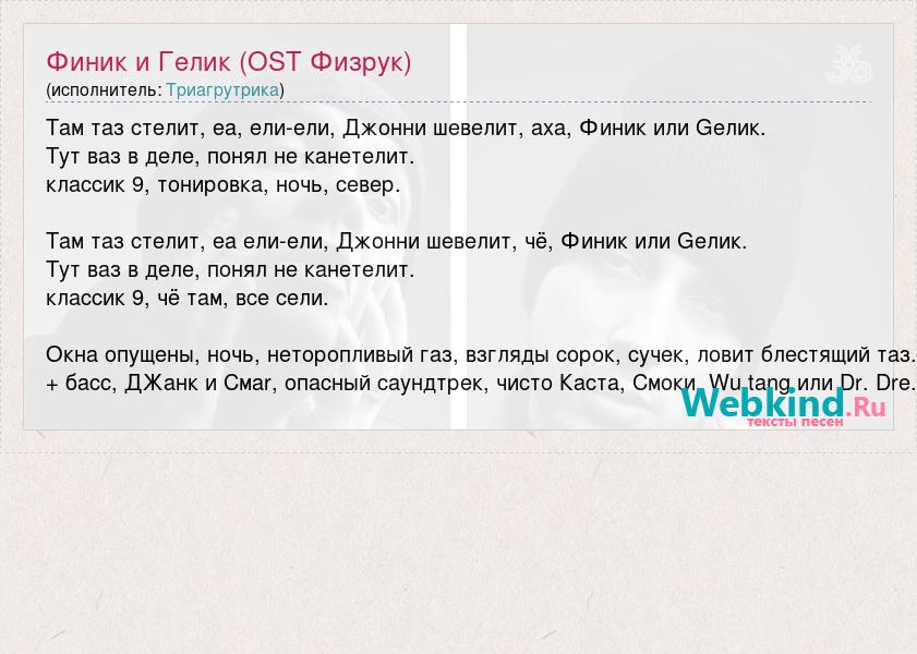 Там таз стелит, еа, ели-ели, Джонни шевелит, аха, Финик или Gелик. Тут ваз в деле, понял не канетелит. классик 9, тонировка, ночь, север. Там таз стелит, еа ели-ели, Джонни шевелит, чё, Финик или Gелик. Тут ваз в деле, понял не канетелит. классик 9, чё там, все сели. Окна опущены, ночь, неторопливый газ, взгляды сорок, сучек, ловит блестящий таз. + басс, ДЖанк и Смаr, опасный саундтрек, чисто Каста, Смоки, Wu tang или Dr. Dre.