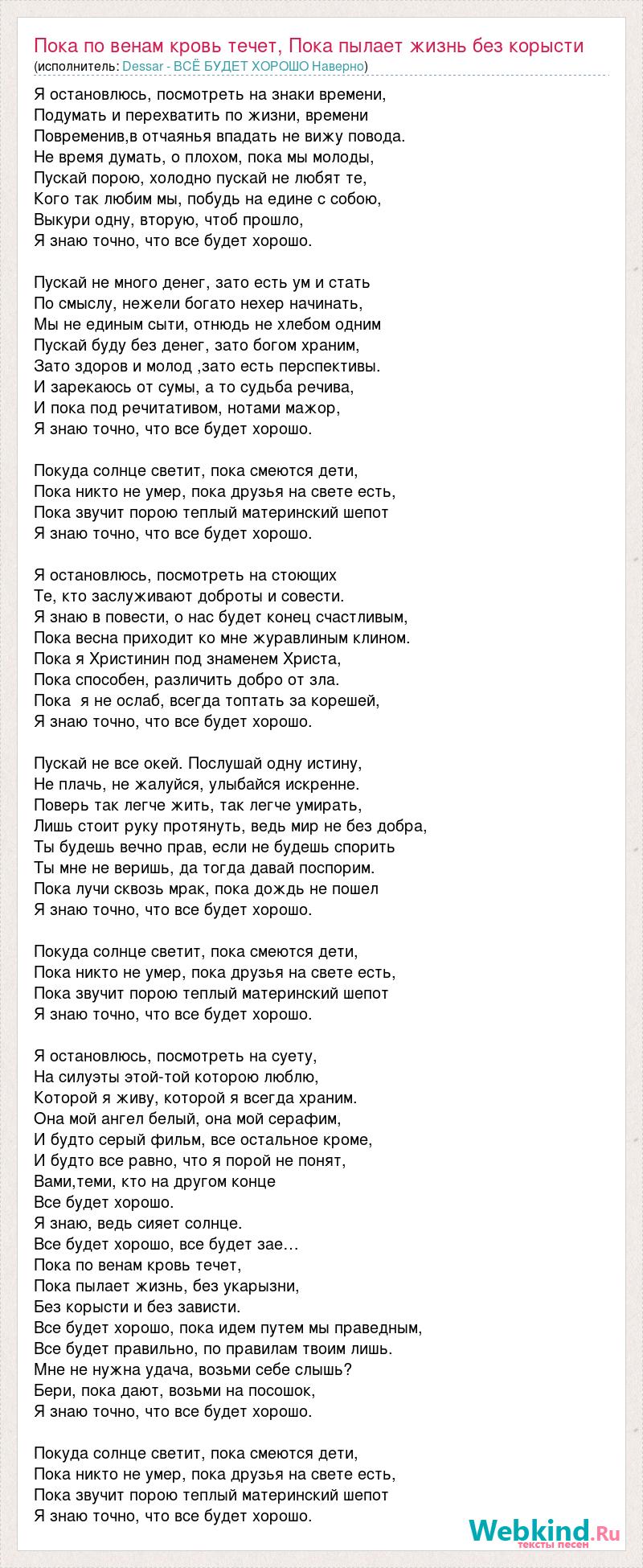 Я остановлюсь, посмотреть на знаки времени, Подумать и перехватить по жизни, времени Повременив,в отчаянья впадать не вижу повода. Не время думать, о плохом, пока мы молоды, Пускай порою, холодно пускай не любят те, Кого так любим мы, побудь на едине с собою, Выкури одну, вторую, чтоб прошло, Я знаю точно, что все будет хорошо. Пускай не много денег, зато есть ум и стать По смыслу, нежели богато нехер начинать, Мы не единым сыти, отнюдь не хлебом одним Пускай буду без денег, зато богом храним, Зато здоров и молод ,зато есть перспективы. И зарекаюсь от сумы, а то судьба речива, И пока под речитативом, нотами мажор, Я знаю точно, что все будет хорошо. Покуда солнце светит, пока смеются дети, Пока никто не умер, пока друзья на свете есть, Пока звучит порою теплый материнский шепот Я знаю точно, что все будет хорошо. Я остановлюсь, посмотреть на стоющих Те, кто заслуживают доброты и совести. Я знаю в повести, о нас будет конец счастливым, Пока весна приходит ко мне журавлиным клином. Пока я Христинин под знаменем Христа, Пока способен, различить добро от зла. Пока я не ослаб, всегда топтать за корешей, Я знаю точно, что все будет хорошо. Пускай не все окей. Послушай одну истину, Не плачь, не жалуйся, улыбайся искренне. Поверь так легче жить, так легче умирать, Лишь стоит руку протянуть, ведь мир не без добра, Ты будешь вечно прав, если не будешь спорить Ты мне не веришь, да тогда давай поспорим. Пока лучи сквозь мрак, пока дождь не пошел Я знаю точно, что все будет хорошо. Покуда солнце светит, пока смеются дети, Пока никто не умер, пока друзья на свете есть, Пока звучит порою теплый материнский шепот Я знаю точно, что все будет хорошо. Я остановлюсь, посмотреть на суету, На силуэты этой-той которою люблю, Которой я живу, которой я всегда храним. Она мой ангел белый, она мой серафим, И будто серый фильм, все остальное кроме, И будто все равно, что я порой не понят, Вами,теми, кто на другом конце Все будет хорошо. Я знаю, ведь сияет солнце. Все будет хорошо, все будет зае… Пока по венам кровь течет, Пока пылает жизнь, без укарызни, Без корысти и без зависти. Все будет хорошо, пока идем путем мы праведным, Все будет правильно, по правилам твоим лишь. Мне не нужна удача, возьми себе слышь? Бери, пока дают, возьми на посошок, Я знаю точно, что все будет хорошо. Покуда солнце светит, пока смеются дети, Пока никто не умер, пока друзья на свете есть, Пока звучит порою теплый материнский шепот Я знаю точно, что все будет хорошо.