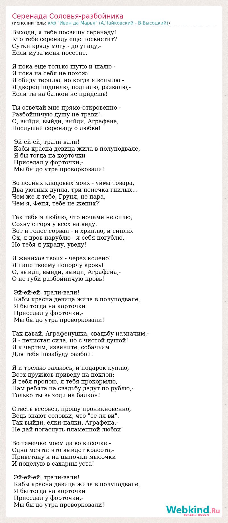 Выходи, я тебе посвящу серенаду! Кто тебе серенаду еще посвистит? Сутки кряду могу - до упаду,- Если муза меня посетит. Я пока еще только шутю и шалю - Я пока на себя не похож: Я обиду терплю, но когда я вспылю - Я дворец подпилю, подпалю, развалю,- Если ты на балкон не придешь! Ты отвечай мне прямо-откровенно - Разбойничую душу не трави!.. О, выйди, выйди, выйди, Аграфена, Послушай серенаду о любви! Эй-ей-ей, трали-вали! Кабы красна девица жила в полуподвале, Я бы тогда на корточки Приседал у форточки,- Мы бы до утра проворковали! Во лесных кладовых моих - уйма товара, Два уютных дупла, три пенечка гнилых... Чем же я тебе, Груня, не пара, Чем я, Феня, тебе не жених?! Так тебя я люблю, что ночами не сплю, Сохну с горя у всех на виду. Вот и голос сорвал - и хриплю, и сиплю. Ох, я дров нарублю - я себя погублю,- Но тебя я украду, уведу! Я женихов твоих - через колено! Я папе твоему попорчу кровь! О, выйди, выйди, выйди, Аграфена,- О не губи разбойничую кровь! Эй-ей-ей, трали-вали! Кабы красна девица жила в полуподвале, Я бы тогда на корточки Приседал у форточки,- Мы бы до утра проворковали! Так давай, Аграфенушка, свадьбу назначим,- Я - нечистая сила, но с чистой душой! Я к чертям, извините, собачьим Для тебя позабуду разбой! Я и трелью зальюсь, и подарок куплю, Всех дружков приведу на поклон; Я тебя пропою, я тебя прокормлю, Нам ребята на свадьбу дадут по рублю,- Только ты выходи на балкон! Ответь всерьез, прошу проникновенно, Ведь знают соловьи, что "се ля ви". Так выйди, елки-палки, Аграфена,- Не дай погаснуть пламенной любви! Во темечке моем да во височке - Одна мечта: что выйдет красота,- Привстану я на цыпочки-мысочки И поцелую в сахарны уста! Эй-ей-ей, трали-вали! Кабы красна девица жила в полуподвале, Я бы тогда на корточки Приседал у форточки,- Мы бы до утра проворковали!