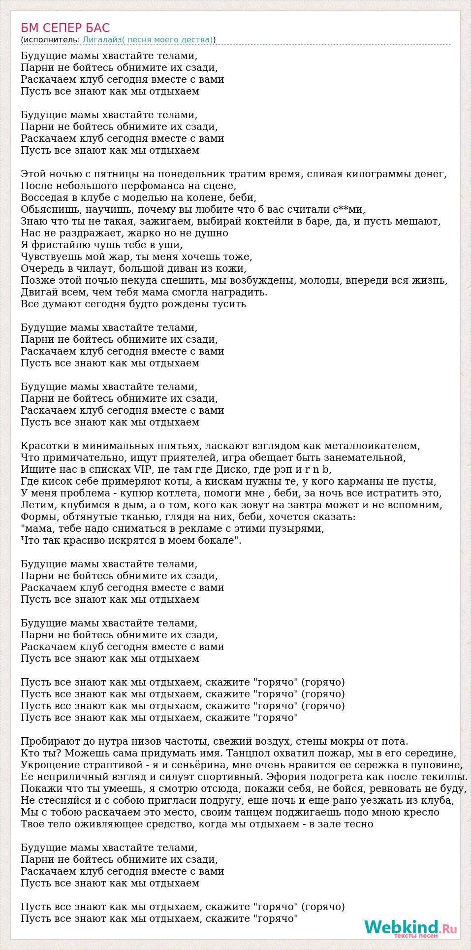 Будущие мамы хвастайте телами, Парни не бойтесь обнимите их сзади, Раскачаем клуб сегодня вместе с вами Пусть все знают как мы отдыхаем Будущие мамы хвастайте телами, Парни не бойтесь обнимите их сзади, Раскачаем клуб сегодня вместе с вами Пусть все знают как мы отдыхаем Этой ночью с пятницы на понедельник тратим время, сливая килограммы денег, После небольшого перфоманса на сцене, Восседая в клубе с моделью на колене, беби, Обьяснишь, научишь, почему вы любите что б вас считали с**ми, Знаю что ты не такая, зажигаем, выбирай коктейли в баре, да, и пусть мешают, Нас не раздражает, жарко но не душно Я фристайлю чушь тебе в уши, Чувствуешь мой жар, ты меня хочешь тоже, Очередь в чилаут, большой диван из кожи, Позже этой ночью некуда спешить, мы возбуждены, молоды, впереди вся жизнь, Двигай всем, чем тебя мама смогла наградить. Все думают сегодня будто рождены тусить Будущие мамы хвастайте телами, Парни не бойтесь обнимите их сзади, Раскачаем клуб сегодня вместе с вами Пусть все знают как мы отдыхаем Будущие мамы хвастайте телами, Парни не бойтесь обнимите их сзади, Раскачаем клуб сегодня вместе с вами Пусть все знают как мы отдыхаем Красотки в минимальных плятьях, ласкают взглядом как металлоикателем, Что примичательно, ищут приятелей, игра обещает быть занемательной, Ищите нас в списках VIP, не там где Диско, где рэп и r n b, Где кисок себе примеряют коты, а кискам нужны те, у кого карманы не пусты, У меня проблема - купюр котлета, помоги мне , беби, за ночь все истратить это, Летим, клубимся в дым, а о том, кого как зовут на завтра может и не вспомним, Формы, обтянутые тканью, глядя на них, беби, хочется сказать: "мама, тебе надо сниматься в рекламе с этими пузырями, Что так красиво искрятся в моем бокале". Будущие мамы хвастайте телами, Парни не бойтесь обнимите их сзади, Раскачаем клуб сегодня вместе с вами Пусть все знают как мы отдыхаем Будущие мамы хвастайте телами, Парни не бойтесь обнимите их сзади, Раскачаем клуб сегодня вместе с вами Пусть все знают как мы отдыхаем Пусть все знают как мы отдыхаем, скажите "горячо" (горячо) Пусть все знают как мы отдыхаем, скажите "горячо" (горячо) Пусть все знают как мы отдыхаем, скажите "горячо" (горячо) Пусть все знают как мы отдыхаем, скажите "горячо" Пробирают до нутра низов частоты, свежий воздух, стены мокры от пота. Кто ты? Можешь сама придумать имя. Танцпол охватил пожар, мы в его середине, Укрощение страптивой - я и сеньёрина, мне очень нравится ее сережка в пуповине, Ее неприличный взгляд и силуэт спортивный. Эфория подогрета как после текиллы. Покажи что ты умеешь, я смотрю отсюда, покажи себя, не бойся, ревновать не буду, Не стесняйся и с собою пригласи подругу, еще ночь и еще рано уезжать из клуба, Мы с тобою раскачаем это место, своим танцем поджигаешь подо мною кресло Твое тело оживляющее средство, когда мы отдыхаем - в зале тесно Будущие мамы хвастайте телами, Парни не бойтесь обнимите их сзади, Раскачаем клуб сегодня вместе с вами Пусть все знают как мы отдыхаем Пусть все знают как мы отдыхаем, скажите "горячо" (горячо) Пусть все знают как мы отдыхаем, скажите "горячо"