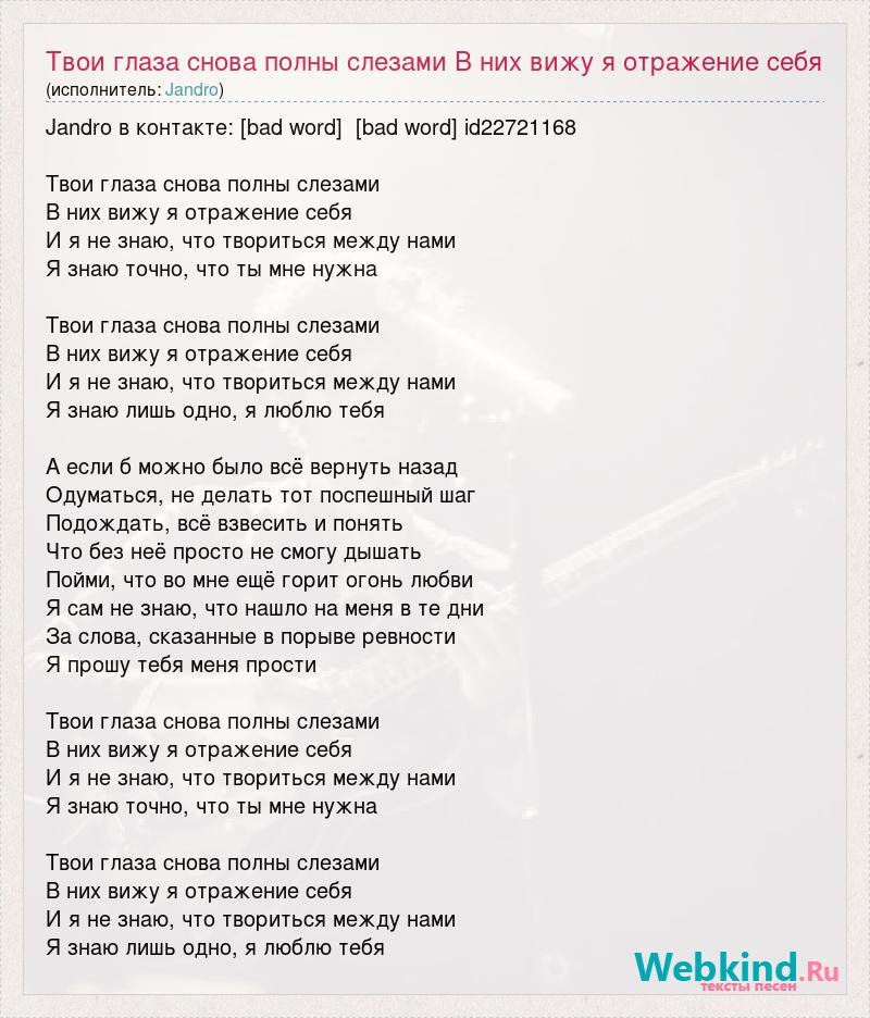 Jandro в контакте: [bad word] [bad word] id22721168 Твои глаза снова полны слезами В них вижу я отражение себя И я не знаю, что твориться между нами Я знаю точно, что ты мне нужна Твои глаза снова полны слезами В них вижу я отражение себя И я не знаю, что твориться между нами Я знаю лишь одно, я люблю тебя А если б можно было всё вернуть назад Одуматься, не делать тот поспешный шаг Подождать, всё взвесить и понять Что без неё просто не смогу дышать Пойми, что во мне ещё горит огонь любви Я сам не знаю, что нашло на меня в те дни За слова, сказанные в порыве ревности Я прошу тебя меня прости Твои глаза снова полны слезами В них вижу я отражение себя И я не знаю, что твориться между нами Я знаю точно, что ты мне нужна Твои глаза снова полны слезами В них вижу я отражение себя И я не знаю, что твориться между нами Я знаю лишь одно, я люблю тебя