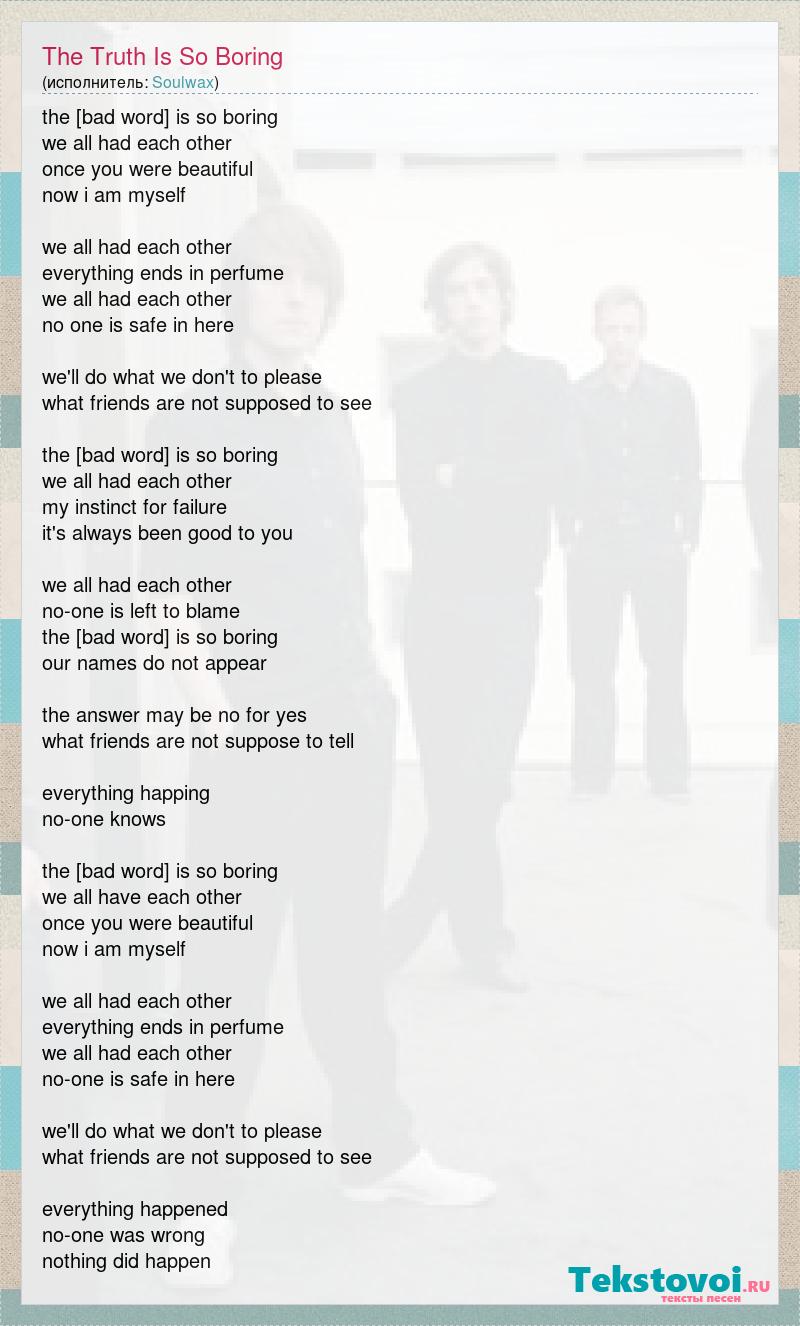 the [bad word] is so boring we all had each other once you were beautiful now i am myself we all had each other everything ends in perfume we all had each other no one is safe in here we'll do what we don't to please what friends are not supposed to see the [bad word] is so boring we all had each other my instinct for failure it's always been good to you we all had each other no-one is left to blame the [bad word] is so boring our names do not appear the answer may be no for yes what friends are not suppose to tell everything happing no-one knows the [bad word] is so boring we all have each other once you were beautiful now i am myself we all had each other everything ends in perfume we all had each other no-one is safe in here we'll do what we don't to please what friends are not supposed to see everything happened no-one was wrong nothing did happen