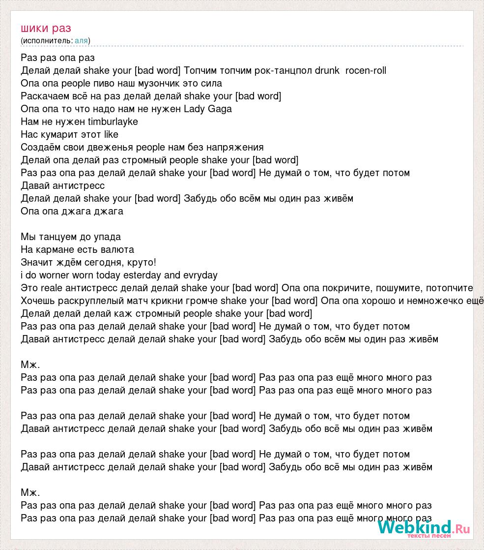 Раз раз опа раз Делай делай shake your [bad word] Топчим топчим рок-танцпол drunk rocen-roll Опа опа people пиво наш музончик это сила Раскачаем всё на раз делай делай shake your [bad word] Опа опа то что надо нам не нужен Lady Gaga Нам не нужен timburlayke Нас кумарит этот like Создаём свои двеженья people нам без напряжения Делай опа делай раз стромный people shake your [bad word] Раз раз опа раз делай делай shake your [bad word] Не думай о том, что будет потом Давай антистресс Делай делай shake your [bad word] Забудь обо всём мы один раз живём Опа опа джага джага Мы танцуем до упада На кармане есть валюта Значит ждём сегодня, круто! i do worner worn today esterday and evryday Это reale антистресс делай делай shake your [bad word] Опа опа покричите, пошумите, потопчите Хочешь раскруплелый матч крикни громче shake your [bad word] Опа опа хорошо и немножечко ещё Делай делай делай каж стромный people shake your [bad word] Раз раз опа раз делай делай shake your [bad word] Не думай о том, что будет потом Давай антистресс делай делай shake your [bad word] Забудь обо всём мы один раз живём Мж. Раз раз опа раз делай делай shake your [bad word] Раз раз опа раз ещё много много раз Раз раз опа раз делай делай shake your [bad word] Раз раз опа раз ещё много много раз Раз раз опа раз делай делай shake your [bad word] Не думай о том, что будет потом Давай антистресс делай делай shake your [bad word] Забудь обо всё мы один раз живём Раз раз опа раз делай делай shake your [bad word] Не думай о том, что будет потом Давай антистресс делай делай shake your [bad word] Забудь обо всё мы один раз живём Мж. Раз раз опа раз делай делай shake your [bad word] Раз раз опа раз ещё много много раз Раз раз опа раз делай делай shake your [bad word] Раз раз опа раз ещё много много раз