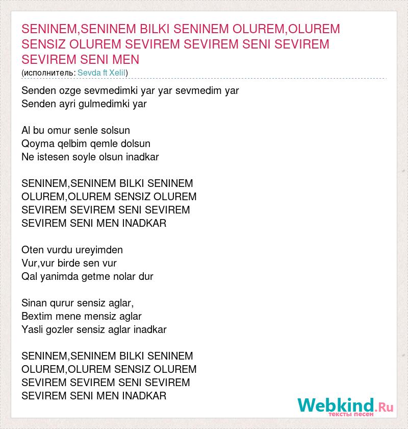 Senden ozge sevmedimki yar yar sevmedim yar Senden ayri gulmedimki yar Al bu omur senle solsun Qoyma qelbim qemle dolsun Ne istesen soyle olsun inadkar SENINEM,SENINEM BILKI SENINEM OLUREM,OLUREM SENSIZ OLUREM SEVIREM SEVIREM SENI SEVIREM SEVIREM SENI MEN INADKAR Oten vurdu ureyimden Vur,vur birde sen vur Qal yanimda getme nolar dur Sinan qurur sensiz aglar, Bextim mene mensiz aglar Yasli gozler sensiz aglar inadkar SENINEM,SENINEM BILKI SENINEM OLUREM,OLUREM SENSIZ OLUREM SEVIREM SEVIREM SENI SEVIREM SEVIREM SENI MEN INADKAR