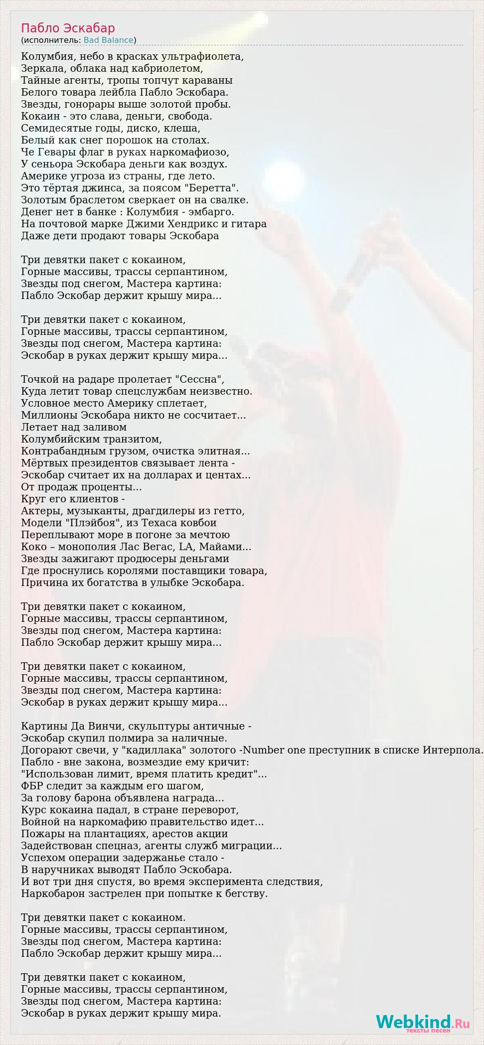 Колумбия, небо в красках ультрафиолета, Зеркала, облака над кабриолетом, Тайные агенты, тропы топчут караваны Белого товара лейбла Пабло Эскобара. Звезды, гонорары выше золотой пробы. Кокаин - это слава, деньги, свобода. Семидесятые годы, диско, клеша, Белый как снег порошок на столах. Че Гевары флаг в руках наркомафиозо, У сеньора Эскобара деньги как воздух. Америке угроза из страны, где лето. Это тёртая джинса, за поясом "Беретта". Золотым браслетом сверкает он на свалке. Денег нет в банке : Колумбия - эмбарго. На почтовой марке Джими Хендрикс и гитара Даже дети продают товары Эскобара Три девятки пакет с кокаином, Горные массивы, трассы серпантином, Звезды под снегом, Мастера картина: Пабло Эскобар держит крышу мира... Три девятки пакет с кокаином, Горные массивы, трассы серпантином, Звезды под снегом, Мастера картина: Эскобар в руках держит крышу мира... Точкой на радаре пролетает "Сессна", Куда летит товар спецслужбам неизвестно. Условное место Америку сплетает, Миллионы Эскобара никто не сосчитает... Летает над заливом Колумбийским транзитом, Контрабандным грузом, очистка элитная... Мёртвых президентов связывает лента - Эскобар считает их на долларах и центах... От продаж проценты... Круг его клиентов - Актеры, музыканты, драгдилеры из гетто, Модели "Плэйбоя", из Техаса ковбои Переплывают море в погоне за мечтою Коко – монополия Лас Вегас, LA, Майами... Звезды зажигают продюсеры деньгами Где проснулись королями поставщики товара, Причина их богатства в улыбке Эскобара. Три девятки пакет с кокаином, Горные массивы, трассы серпантином, Звезды под снегом, Мастера картина: Пабло Эскобар держит крышу мира... Три девятки пакет с кокаином, Горные массивы, трассы серпантином, Звезды под снегом, Мастера картина: Эскобар в руках держит крышу мира... Картины Да Винчи, скульптуры античные - Эскобар скупил полмира за наличные. Догорают свечи, у "кадиллака" золотого -Number one преступник в списке Интерпола. Пабло - вне закона, возмездие ему кричит: "Использован лимит, время платить кредит"... ФБР следит за каждым его шагом, За голову барона объявлена награда... Курс кокаина падал, в стране переворот, Войной на наркомафию правительство идет... Пожары на плантациях, арестов акции Задействован спецназ, агенты служб миграции... Успехом операции задержанье стало - В наручниках выводят Пабло Эскобара. И вот три дня спустя, во время эксперимента следствия, Наркобарон застрелен при попытке к бегству. Три девятки пакет с кокаином. Горные массивы, трассы серпантином, Звезды под снегом, Мастера картина: Пабло Эскобар держит крышу мира... Три девятки пакет с кокаином, Горные массивы, трассы серпантином, Звезды под снегом, Мастера картина: Эскобар в руках держит крышу мира.