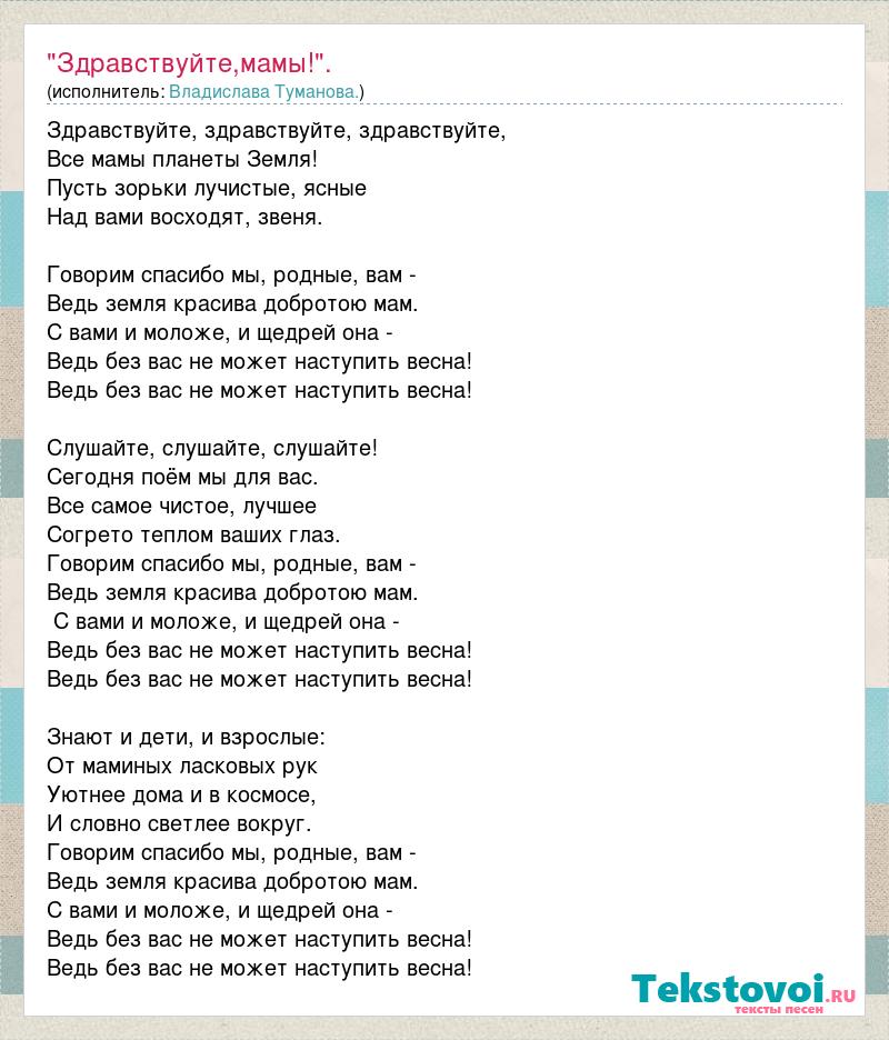 Здравствуйте, здравствуйте, здравствуйте, Все мамы планеты Земля! Пусть зорьки лучистые, ясные Над вами восходят, звеня. Говорим спасибо мы, родные, вам - Ведь земля красива добротою мам. С вами и моложе, и щедрей она - Ведь без вас не может наступить весна! Ведь без вас не может наступить весна! Слушайте, слушайте, слушайте! Сегодня поём мы для вас. Все самое чистое, лучшее Согрето теплом ваших глаз. Говорим спасибо мы, родные, вам - Ведь земля красива добротою мам. С вами и моложе, и щедрей она - Ведь без вас не может наступить весна! Ведь без вас не может наступить весна! Знают и дети, и взрослые: От маминых ласковых рук Уютнее дома и в космосе, И словно светлее вокруг. Говорим спасибо мы, родные, вам - Ведь земля красива добротою мам. С вами и моложе, и щедрей она - Ведь без вас не может наступить весна! Ведь без вас не может наступить весна!