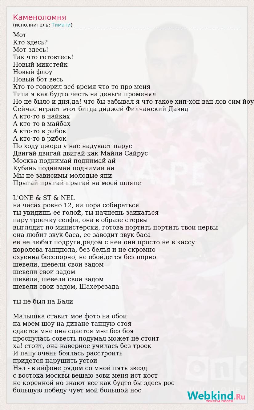 Мот Кто здесь? Мот здесь! Так что готовтесь! Новый микстейк Новый флоу Новый бот весь Кто-то говорил всё время что-то про меня Типа я как будто честь на деньги променял Но не было и дня,да! что бы забывал я что такое хип-хоп ван лов сим йоу Сейчас играет этот бигда диджей Филчанский Давид А кто-то в найках А кто-то в майбах А кто-то в рибок А кто-то в рибок По ходу джорд у нас надувает парус Двигай двигай двигай как Майли Сайрус Москва поднимай поднимай ай Кубань поднимай поднимай ай Мы не зависимы молодые япи Прыгай прыгай прыгай на моей шляпе L'ONE & ST & NEL на часах ровно 12, ей пора собираться ты увидишь ее голой, ты начнешь заикаться пару троечку селфи, она в образе стервы выглядит по министерски, готова портить портить твои нервы она любит звук баса, ее заводит звук баса ее не любят подруги,рядом с ней они просто не в кассу королева танцпола, без белья и не скромно охуенна бесспорно, не обойдется без порно шевели, шевели свои задом шевели свои задом шевели, шевели свои задом шевели свои задом, Шахерезада ты не был на Бали Малышка ставит мое фото на обои на моем шоу на диване танцую стоя сдается мне она сдается мне без боя проснулась совесть подумал может не стоит ха! стоит, она наверное училась без троек И папу очень боялась расстроить придется нарушить устои Нэл - в айфоне рядом со мной пять звезд с востока москвы вещаю зови меня ист кост не коренной но знают все как будто бы здесь рос большую победу чует мой большой нос