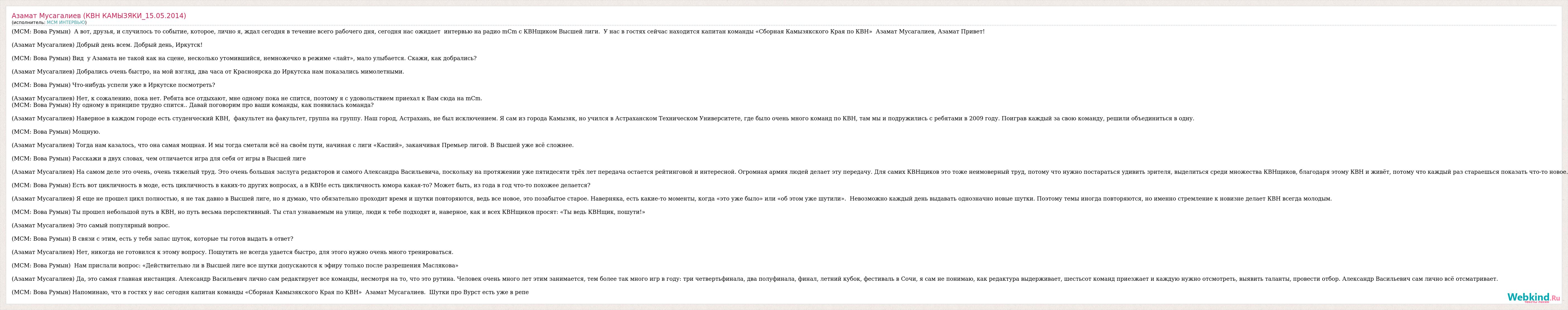 (МСМ: Вова Румын) А вот, друзья, и случилось то событие, которое, лично я, ждал сегодня в течение всего рабочего дня, сегодня нас ожидает интервью на радио mCm с КВНщиком Высшей лиги. У нас в гостях сейчас находится капитан команды «Сборная Камызякского Края по КВН» Азамат Мусагалиев, Азамат Привет! (Азамат Мусагалиев) Добрый день всем. Добрый день, Иркутск! (МСМ: Вова Румын) Вид у Азамата не такой как на сцене, несколько утомившийся, немножечко в режиме «лайт», мало улыбается. Скажи, как добрались? (Азамат Мусагалиев) Добрались очень быстро, на мой взгляд, два часа от Красноярска до Иркутска нам показались мимолетными. (МСМ: Вова Румын) Что-нибудь успели уже в Иркутске посмотреть? (Азамат Мусагалиев) Нет, к сожалению, пока нет. Ребята все отдыхают, мне одному пока не спится, поэтому я с удовольствием приехал к Вам сюда на mCm. (МСМ: Вова Румын) Ну одному в принципе трудно спится.. Давай поговорим про ваши команды, как появилась команда? (Азамат Мусагалиев) Наверное в каждом городе есть студенческий КВН, факультет на факультет, группа на группу. Наш город, Астрахань, не был исключением. Я сам из города Камызяк, но учился в Астраханском Техническом Университете, где было очень много команд по КВН, там мы и подружились с ребятами в 2009 году. Поиграв каждый за свою команду, решили объединиться в одну. (МСМ: Вова Румын) Мощную. (Азамат Мусагалиев) Тогда нам казалось, что она самая мощная. И мы тогда сметали всё на своём пути, начиная с лиги «Каспий», заканчивая Премьер лигой. В Высшей уже всё сложнее. (МСМ: Вова Румын) Расскажи в двух словах, чем отличается игра для себя от игры в Высшей лиге (Азамат Мусагалиев) На самом деле это очень, очень тяжелый труд. Это очень большая заслуга редакторов и самого Александра Васильевича, поскольку на протяжении уже пятидесяти трёх лет передача остается рейтинговой и интересной. Огромная армия людей делает эту передачу. Для самих КВНщиков это тоже неимоверный труд, потому что нужно постараться удивить зрителя, выделиться среди множества КВНщиков, благодаря этому КВН и живёт, потому что каждый раз стараешься показать что-то новое. (МСМ: Вова Румын) Есть вот цикличность в моде, есть цикличность в каких-то других вопросах, а в КВНе есть цикличность юмора какая-то? Может быть, из года в год что-то похожее делается? (Азамат Мусагалиев) Я еще не прошел цикл полностью, я не так давно в Высшей лиге, но я думаю, что обязательно проходит время и шутки повторяются, ведь все новое, это позабытое старое. Наверняка, есть какие-то моменты, когда «это уже было» или «об этом уже шутили». Невозможно каждый день выдавать однозначно новые шутки. Поэтому темы иногда повторяются, но именно стремление к новизне делает КВН всегда молодым. (МСМ: Вова Румын) Ты прошел небольшой путь в КВН, но путь весьма перспективный. Ты стал узнаваемым на улице, люди к тебе подходят и, наверное, как и всех КВНщиков просят: «Ты ведь КВНщик, пошути!» (Азамат Мусагалиев) Это самый популярный вопрос. (МСМ: Вова Румын) В связи с этим, есть у тебя запас шуток, которые ты готов выдать в ответ? (Азамат Мусагалиев) Нет, никогда не готовился к этому вопросу. Пошутить не всегда удается быстро, для этого нужно очень много тренироваться. (МСМ: Вова Румын) Нам прислали вопрос: «Действительно ли в Высшей лиге все шутки допускаются к эфиру только после разрешения Маслякова» (Азамат Мусагалиев) Да, эт