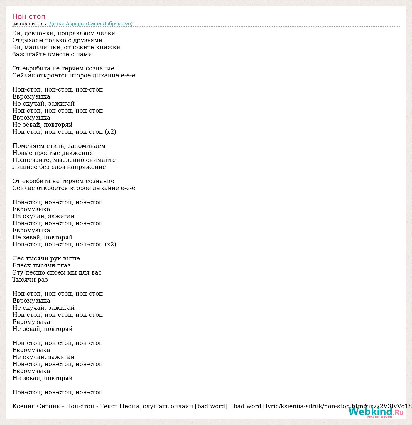 Эй, девчонки, поправляем чёлки Отдыхаем только с друзьями Эй, мальчишки, отложите книжки Зажигайте вместе с нами От евробита не теряем сознание Сейчас откроется второе дыхание е-е-е Нон-стоп, нон-стоп, нон-стоп Евромузыка Не скучай, зажигай Нон-стоп, нон-стоп, нон-стоп Евромузыка Не зевай, повторяй Нон-стоп, нон-стоп, нон-стоп (x2) Поменяем стиль, запоминаем Новые простые движения Подпевайте, мысленно снимайте Лишнее без слов напряжение От евробита не теряем сознание Сейчас откроется второе дыхание е-е-е Нон-стоп, нон-стоп, нон-стоп Евромузыка Не скучай, зажигай Нон-стоп, нон-стоп, нон-стоп Евромузыка Не зевай, повторяй Нон-стоп, нон-стоп, нон-стоп (x2) Лес тысячи рук выше Блеск тысячи глаз Эту песню споём мы для вас Тысячи раз Нон-стоп, нон-стоп, нон-стоп Евромузыка Не скучай, зажигай Нон-стоп, нон-стоп, нон-стоп Евромузыка Не зевай, повторяй Нон-стоп, нон-стоп, нон-стоп Евромузыка Не скучай, зажигай Нон-стоп, нон-стоп, нон-стоп Евромузыка Не зевай, повторяй Нон-стоп, нон-стоп, нон-стоп Ксения Ситник - Нон-стоп - Текст Песни, слушать онлайн [bad word] [bad word] lyric/ksieniia-sitnik/non-stop.htm#ixzz2V3IvVc18