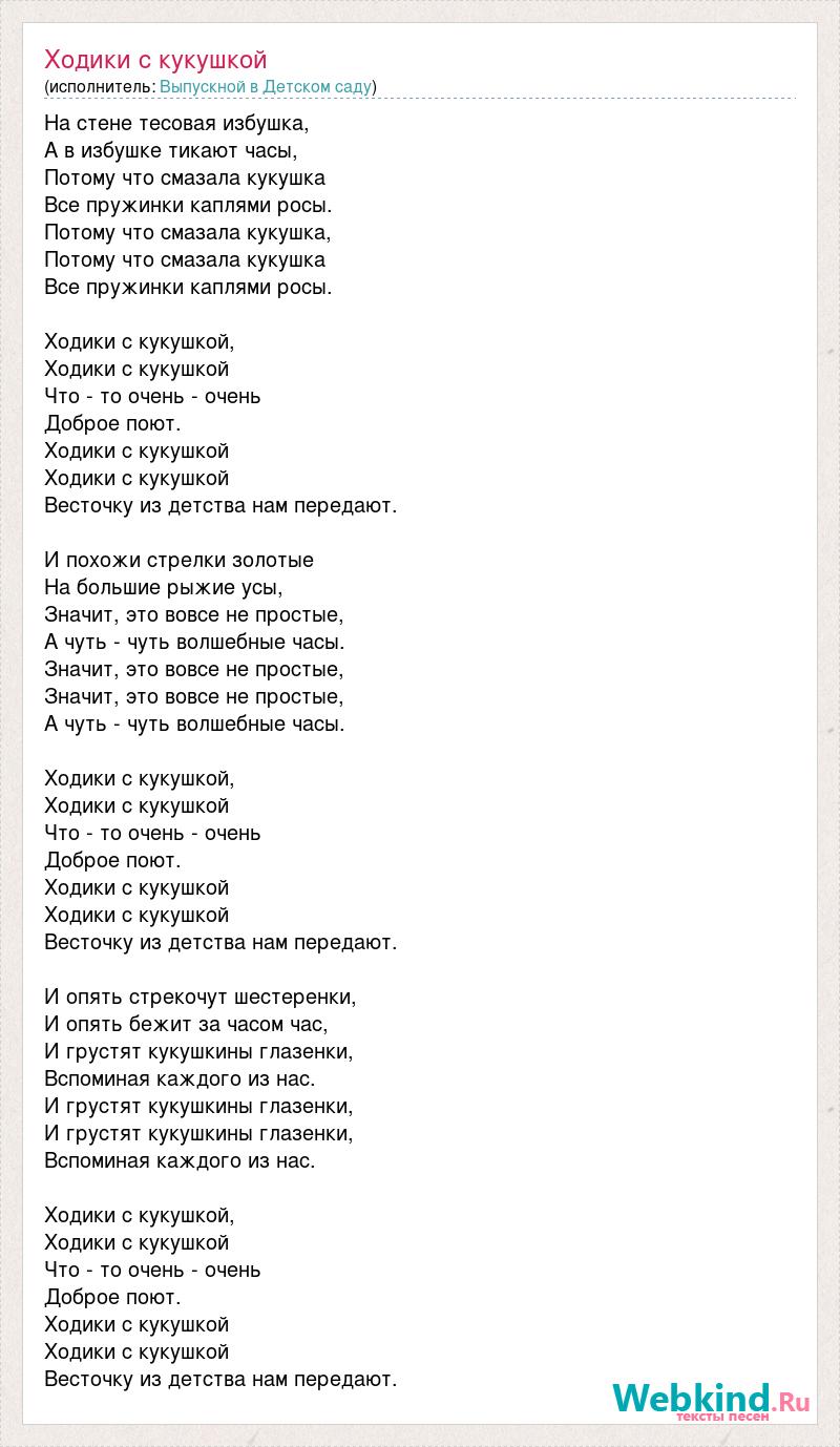 На стене тесовая избушка, А в избушке тикают часы, Потому что смазала кукушка Все пружинки каплями росы. Потому что смазала кукушка, Потому что смазала кукушка Все пружинки каплями росы. Ходики с кукушкой, Ходики с кукушкой Что - то очень - очень Доброе поют. Ходики с кукушкой Ходики с кукушкой Весточку из детства нам передают. И похожи стрелки золотые На большие рыжие усы, Значит, это вовсе не простые, А чуть - чуть волшебные часы. Значит, это вовсе не простые, Значит, это вовсе не простые, А чуть - чуть волшебные часы. Ходики с кукушкой, Ходики с кукушкой Что - то очень - очень Доброе поют. Ходики с кукушкой Ходики с кукушкой Весточку из детства нам передают. И опять стрекочут шестеренки, И опять бежит за часом час, И грустят кукушкины глазенки, Вспоминая каждого из нас. И грустят кукушкины глазенки, И грустят кукушкины глазенки, Вспоминая каждого из нас. Ходики с кукушкой, Ходики с кукушкой Что - то очень - очень Доброе поют. Ходики с кукушкой Ходики с кукушкой Весточку из детства нам передают.
