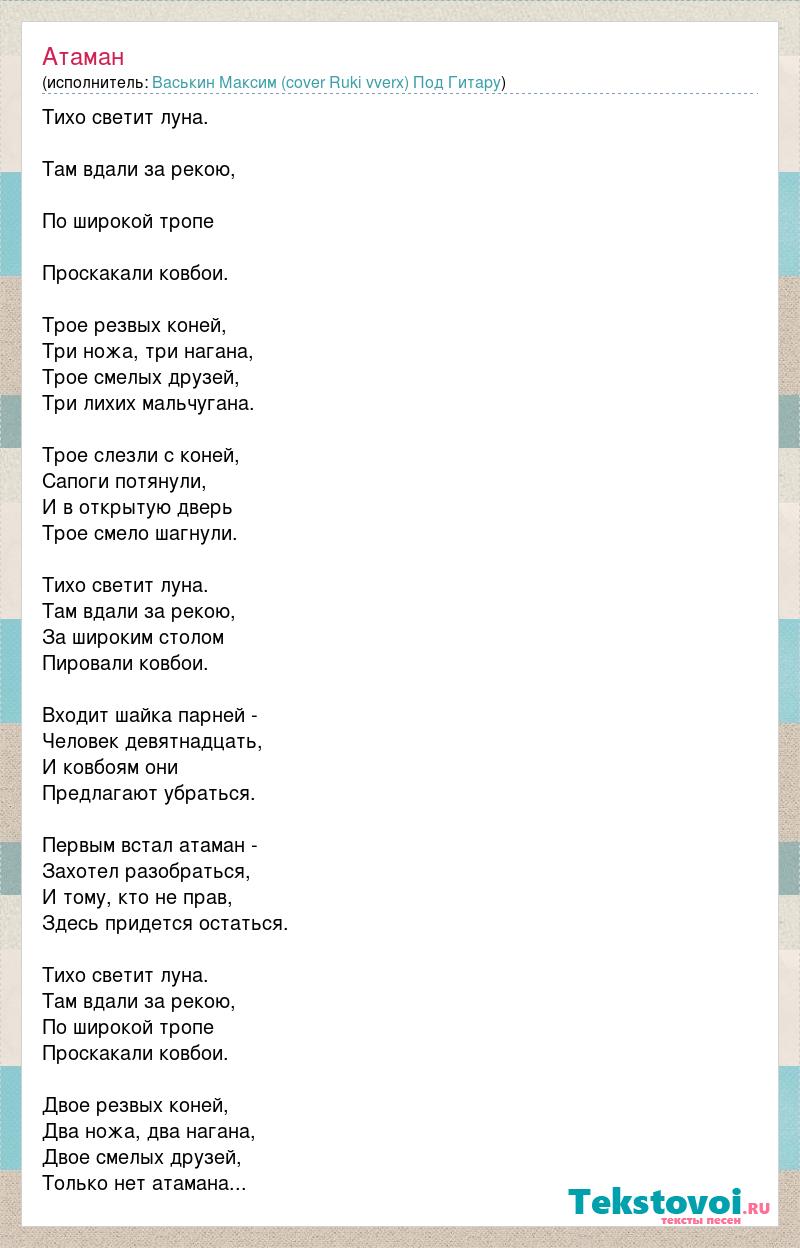 Тихо светит луна. Там вдали за рекою, По широкой тропе Проскакали ковбои. Трое резвых коней, Три ножа, три нагана, Трое смелых друзей, Три лихих мальчугана. Трое слезли с коней, Сапоги потянули, И в открытую дверь Трое смело шагнули. Тихо светит луна. Там вдали за рекою, За широким столом Пировали ковбои. Входит шайка парней - Человек девятнадцать, И ковбоям они Предлагают убраться. Первым встал атаман - Захотел разобраться, И тому, кто не прав, Здесь придeтся остаться. Тихо светит луна. Там вдали за рекою, По широкой тропе Проскакали ковбои. Двое резвых коней, Два ножа, два нагана, Двое смелых друзей, Только нет атамана...