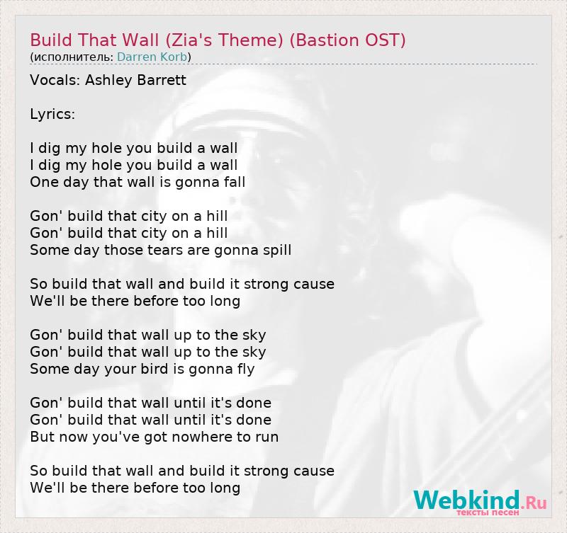 Vocals: Ashley Barrett Lyrics: I dig my hole you build a wall I dig my hole you build a wall One day that wall is gonna fall Gon' build that city on a hill Gon' build that city on a hill Some day those tears are gonna spill So build that wall and build it strong cause We'll be there before too long Gon' build that wall up to the sky Gon' build that wall up to the sky Some day your bird is gonna fly Gon' build that wall until it's done Gon' build that wall until it's done But now you've got nowhere to run So build that wall and build it strong cause We'll be there before too long