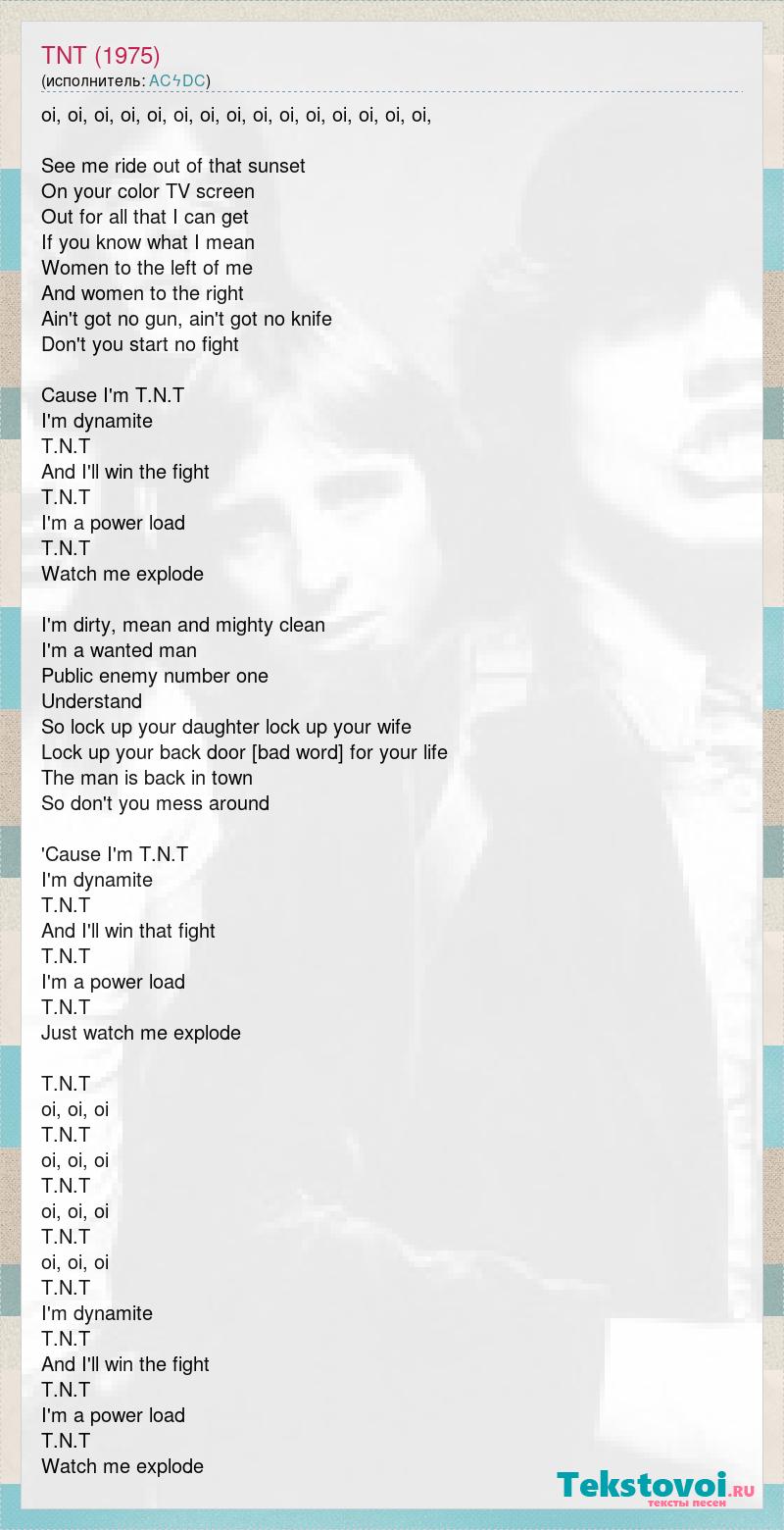 oi, oi, oi, oi, oi, oi, oi, oi, oi, oi, oi, oi, oi, oi, oi, See me ride out of that sunset On your color TV screen Out for all that I can get If you know what I mean Women to the left of me And women to the right Ain't got no gun, ain't got no knife Don't you start no fight Cause I'm T.N.T I'm dynamite T.N.T And I'll win the fight T.N.T I'm a power load T.N.T Watch me explode I'm dirty, mean and mighty clean I'm a wanted man Public enemy number one Understand So lock up your daughter lock up your wife Lock up your back door and run for your life The man is back in town So don't you mess around 'Cause I'm T.N.T I'm dynamite T.N.T And I'll win that fight T.N.T I'm a power load T.N.T Just watch me explode T.N.T oi, oi, oi T.N.T oi, oi, oi T.N.T oi, oi, oi T.N.T oi, oi, oi T.N.T I'm dynamite T.N.T And I'll win the fight T.N.T I'm a power load T.N.T Watch me explode