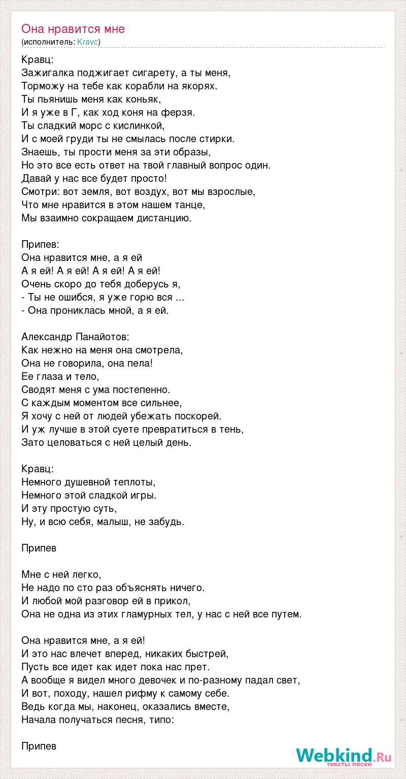 Кравц: Зажигалка поджигает сигарету, а ты меня, Торможу на тебе как корабли на якорях. Ты пьянишь меня как коньяк, И я уже в Г, как ход коня на ферзя. Ты сладкий морс с кислинкой, И с моей груди ты не смылась после стирки. Знаешь, ты прости меня за эти образы, Но это все есть ответ на твой главный вопрос один. Давай у нас все будет просто! Смотри: вот земля, вот воздух, вот мы взрослые, Что мне нравится в этом нашем танце, Мы взаимно сокращаем дистанцию. Припев: Она нравится мне, а я ей А я ей! А я ей! А я ей! А я ей! Очень скоро до тебя доберусь я, - Ты не ошибся, я уже горю вся ... - Она прониклась мной, а я ей. Александр Панайотов: Как нежно на меня она смотрела, Она не говорила, она пела! Ее глаза и тело, Сводят меня с ума постепенно. С каждым моментом все сильнее, Я хочу с ней от людей убежать поскорей. И уж лучше в этой суете превратиться в тень, Зато целоваться с ней целый день. Кравц: Немного душевной теплоты, Немного этой сладкой игры. И эту простую суть, Ну, и всю себя, малыш, не забудь. Припев Мне с ней легко, Не надо по сто раз объяснять ничего. И любой мой разговор ей в прикол, Она не одна из этих гламурных тел, у нас с ней все путем. Она нравится мне, а я ей! И это нас влечет вперед, никаких быстрей, Пусть все идет как идет пока нас прет. А вообще я видел много девочек и по-разному падал свет, И вот, походу, нашел рифму к самому себе. Ведь когда мы, наконец, оказались вместе, Начала получаться песня, типо: Припев