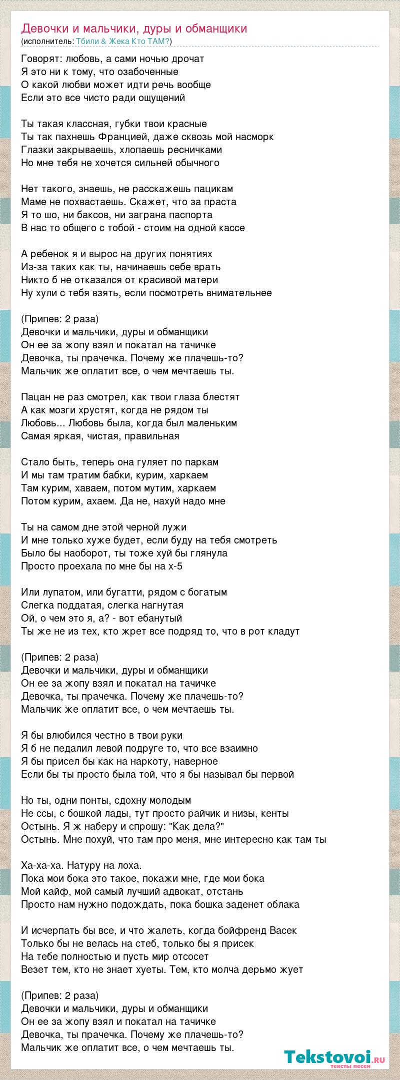 Говорят: любовь, а сами ночью дрочат Я это ни к тому, что озабоченные О какой любви может идти речь вообще Если это все чисто ради ощущений Ты такая классная, губки твои красные Ты так пахнешь Францией, даже сквозь мой насморк Глазки закрываешь, хлопаешь ресничками Но мне тебя не хочется сильней обычного Нет такого, знаешь, не расскажешь пацикам Маме не похвастаешь. Скажет, что за праста Я то шо, ни баксов, ни заграна паспорта В нас то общего с тобой - стоим на одной кассе А ребенок я и вырос на других понятиях Из-за таких как ты, начинаешь себе врать Никто б не отказался от красивой матери Ну хули с тебя взять, если посмотреть внимательнее (Припев: 2 раза) Девочки и мальчики, дуры и обманщики Он ее за жопу взял и покатал на тачичке Девочка, ты прачечка. Почему же плачешь-то? Мальчик же оплатит все, о чем мечтаешь ты. Пацан не раз смотрел, как твои глаза блестят А как мозги хрустят, когда не рядом ты Любовь... Любовь была, когда был маленьким Самая яркая, чистая, правильная Стало быть, теперь она гуляет по паркам И мы там тратим бабки, курим, харкаем Там курим, хаваем, потом мутим, харкаем Потом курим, ахаем. Да не, нахуй надо мне Ты на самом дне этой черной лужи И мне только хуже будет, если буду на тебя смотреть Было бы наоборот, ты тоже хуй бы глянула Просто проехала по мне бы на x-5 Или лупатом, или бугатти, рядом с богатым Слегка поддатая, слегка нагнутая Ой, о чем это я, а? - вот ебанутый Ты же не из тех, кто жрет все подряд то, что в рот кладут (Припев: 2 раза) Девочки и мальчики, дуры и обманщики Он ее за жопу взял и покатал на тачичке Девочка, ты прачечка. Почему же плачешь-то? Мальчик же оплатит все, о чем мечтаешь ты. Я бы влюбился честно в твои руки Я б не педалил левой подруге то, что все взаимно Я бы присел бы как на наркоту, наверное Если бы ты просто была той, что я бы называл бы первой Но ты, одни понты, сдохну молодым Не ссы, с бошкой лады, тут просто райчик и низы, кенты Остынь. Я ж наберу и спрошу: "Как дела?" Остынь. Мне похуй, что там про меня, мне интересно как там ты Ха-ха-ха. Натуру на лоха. Пока мои бока это такое, покажи мне, где мои бока Мой кайф, мой самый лучший адвокат, отстань Просто нам нужно подождать, пока бошка заденет облака И исчерпать бы все, и что жалеть, когда бойфренд Васек Только бы не велась на стеб, только бы я присек На тебе полностью и пусть мир отсосет Везет тем, кто не знает хуеты. Тем, кто молча дерьмо жует (Припев: 2 раза) Девочки и мальчики, дуры и обманщики Он ее за жопу взял и покатал на тачичке Девочка, ты прачечка. Почему же плачешь-то? Мальчик же оплатит все, о чем мечтаешь ты.